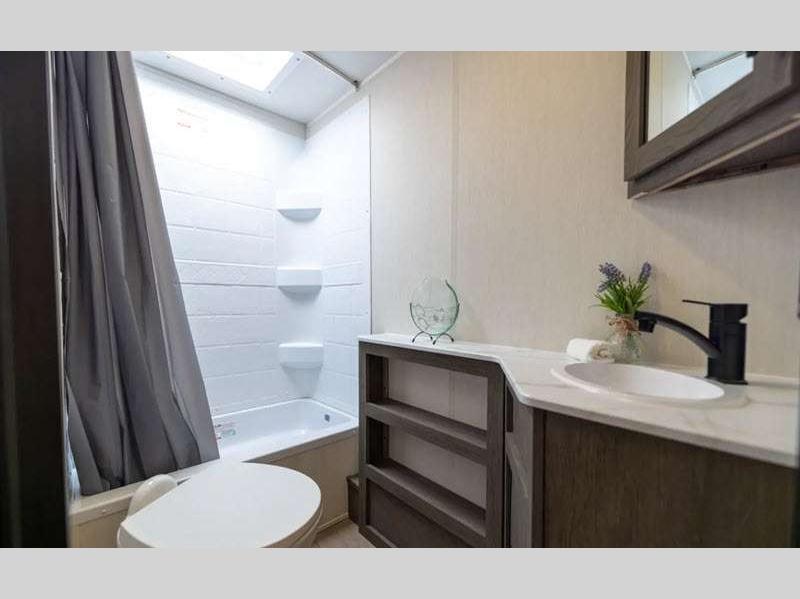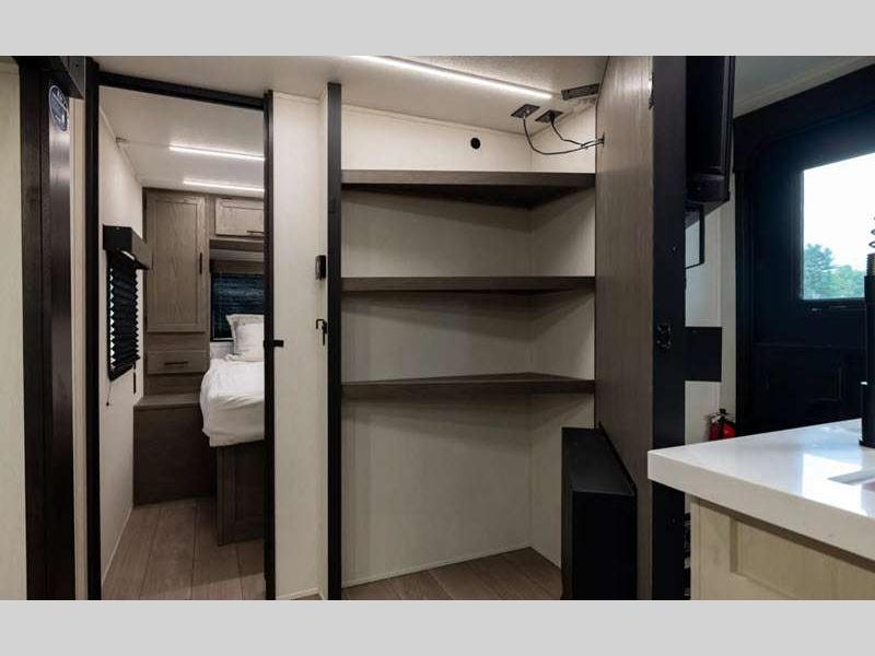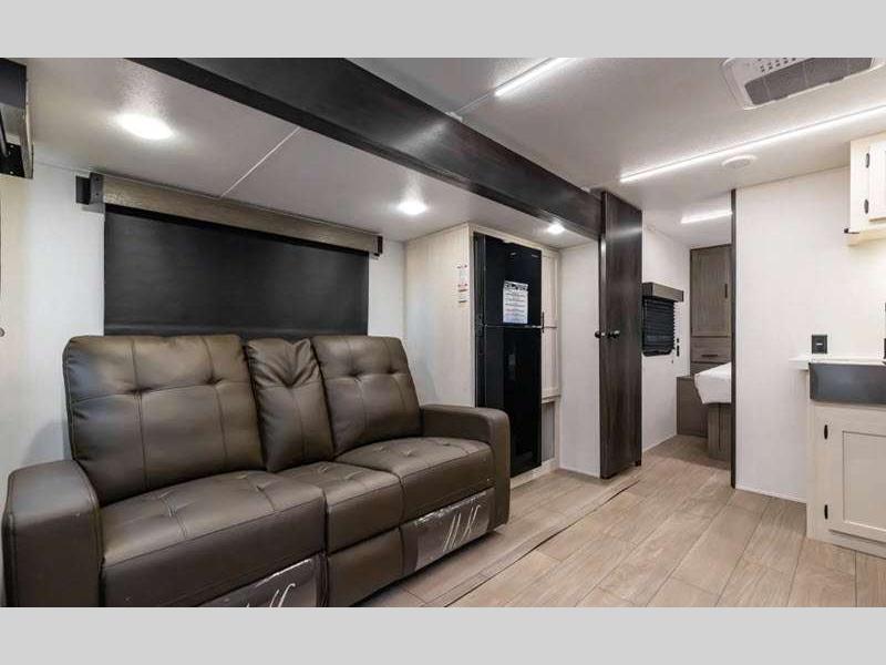 Each Alpha Wolf is constructed with a 1x engineered wood "SuperTruss" roof structure and upgraded laminated exterior walls for a tough travel trailer that will last. You will love the carpetless floor design for easy cleaning, plus there is a super-lumen lighting system with a dimmer in the living room, kitchen, and main bedroom to keep your space bright. Outside, you'll appreciate the "SuperStor" basement storage compartment, along with a power front jack with a light, an exterior shower, and 12V heat pads on all holding tanks for added protection.