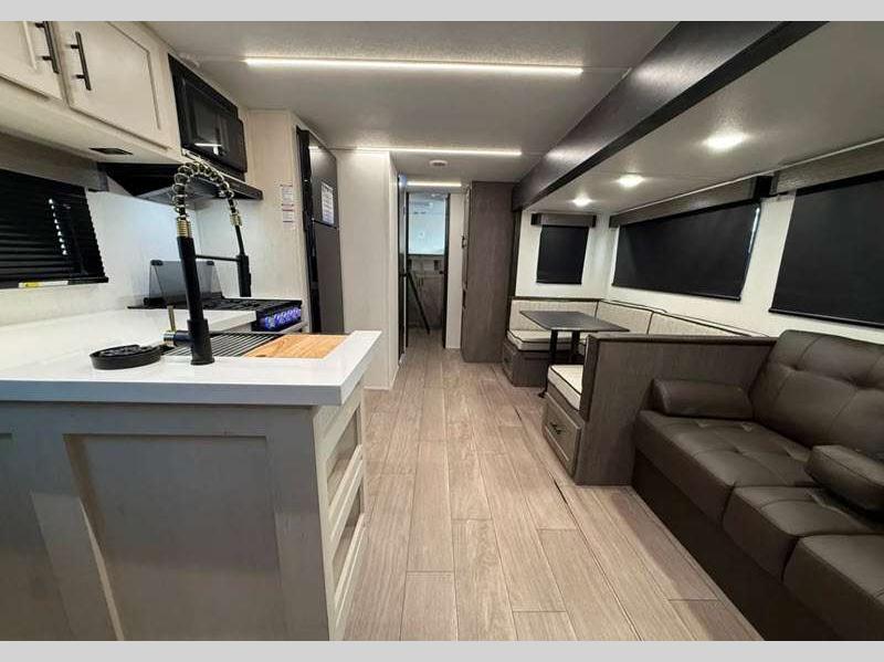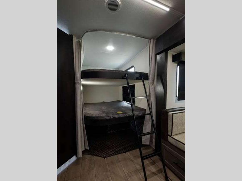 Sleeps 8 Slides 1 Length 30 ft 9 in Ext Width 8 ft Ext Height 11 ft Hitch Weight 945 lbs GVWR 7945 lbs Dry Weight 6403 lbs Cargo Capacity 1542 lbs Fresh Water Capacity 81 gals Grey Water Capacity 35 gals Black Water Capacity 35 gals Number Of Bunks 2 Available Beds Queen Refrigerator Type 12V Residential Style Refrigerator Size 10 cu ft Cooktop Burners 3 Number of Awnings 1 Water Heater Type On Demand Tankless AC BTU 15000 btu TV Info LED TV Awning Info 18' Axle Count 2 Shower Type Tub/Shower Combo Electrical Service 50 amp Solar Wattage 100 watts Similar Floorplans