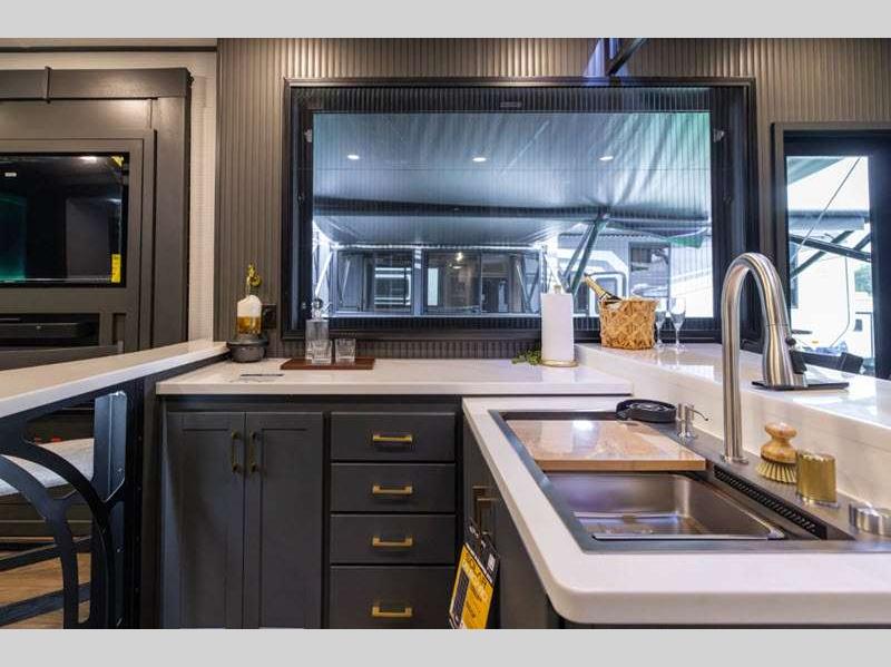 Sleeps 8 Slides 3 Length 40 ft 5 in Ext Width 8 ft 6 in Ext Height 13 ft 6 in Hitch Weight 3250 lbs Dry Weight 13969 lbs Cargo Capacity 3281 lbs Fresh Water Capacity 150 gals Grey Water Capacity 120 gals Black Water Capacity 80 gals Tire Size 16" Generator 6.0 NPS Fuel Capacity 40 gals Number Of Bunks 1 Available Beds King Refrigerator Type 12 V Residential Refrigerator Size 16 cu ft Shower Size 48" Number of Awnings 2 Garage Size 12 ft 6 in LP Tank Capacity 30Lbs. AC BTU 54000 btu TV Info LR 55" TV Awning Info 10'10" & 10'10" Electric Awnings w/ LED Lights Axle Count 2 Washer/Dryer Available Yes Number of LP Tanks 2 Shower Type Standard Electrical Service 50 amp Solar Wattage 200 watts Similar Floorplans