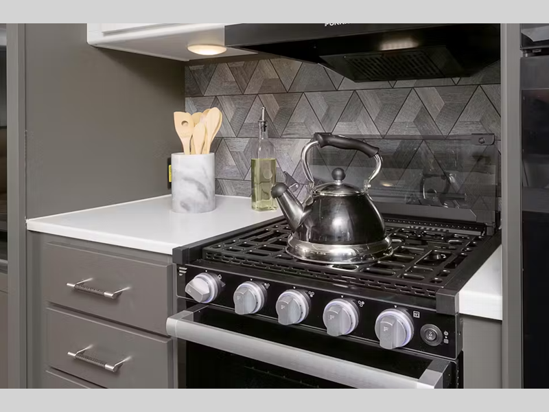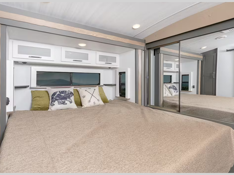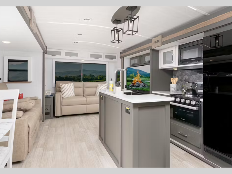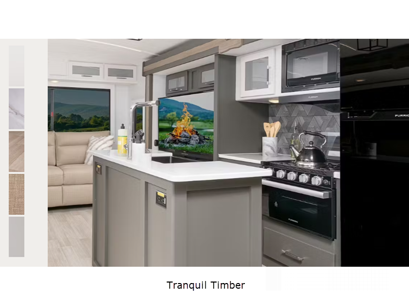 Sleeps 5 Slides 2 Length 30 ft 10 in Ext Height 11 ft 3 in Interior Color Tranquil Timber Hitch Weight 910 lbs Dry Weight 7080 lbs Cargo Capacity 1920 lbs Fresh Water Capacity 54 gals Grey Water Capacity 76 gals Black Water Capacity 38 gals Tire Size ST225/75R15E Furnace BTU 30000 btu Available Beds King Refrigerator Type 12V Double Door Refrigerator Size 10 cu ft Cooktop Burners 3 Number of Awnings 1 LP Tank Capacity 20 lbs Water Heater Type Girard Tankless AC BTU 15000 btu TV Info LR 12V Smart TV Awning Info 19' Axle Count 2 Number of LP Tanks 2 Shower Type Radius Similar Floorplans