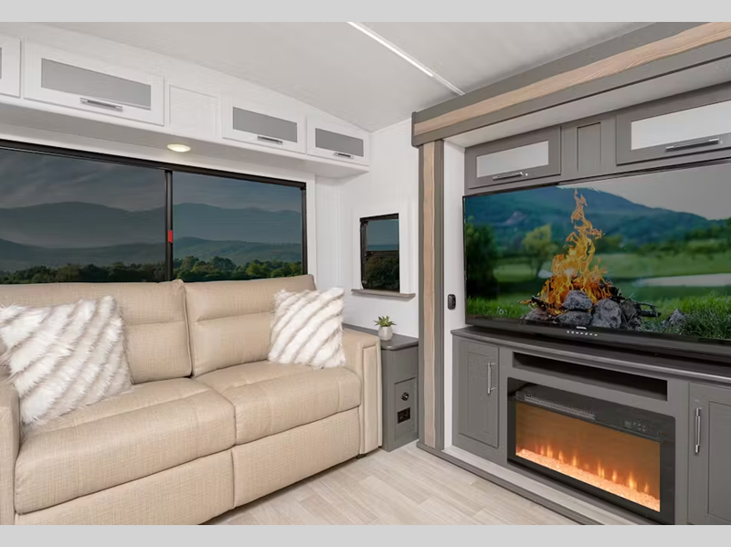 Sleeps 5 Slides 3 Length 35 ft 11 in Ext Height 11 ft 4 in Interior Color Tranquil Timber Hitch Weight 1030 lbs Dry Weight 8215 lbs Cargo Capacity 2285 lbs Fresh Water Capacity 54 gals Grey Water Capacity 76 gals Black Water Capacity 38 gals Tire Size ST225/75R15E Furnace BTU 30000 btu Available Beds King Refrigerator Type 12V Double Door Refrigerator Size 10 cu ft Cooktop Burners 3 Number of Awnings 2 LP Tank Capacity 20 lbs Water Heater Type Girard Tankless AC BTU 15000 btu TV Info LR 12V Smart TV Axle Count 2 Number of LP Tanks 2 Shower Type Standard Similar Floorplans