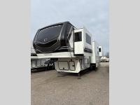 Life will be easier at the campground in this fifth wheel with a bath and a half! The full rear bathroom has a 48" x 30" fiberglass shower with a seat and skylight above, a linen closet to keep your towels close, a dual sink vanity for two to get ready at once, and a barn door to close off the master suite. The bedroom also has a king bed slide with storage underneath across from a dresser with a Smart TV and wardrobe, as well as a large closet with stackable washer and dryer prep. The chef can prepare their best meals with the kitchen island, convection microwave and 24" range, plus there is a pantry/buffet and a pivot dinette to enjoy your meals at. The front living area will have you feeling right at home with the front entertainment center that has a telescoping Smart TV, a 5,000 BTU decorative fireplace heater, and storage on either side. There is also opposing hide-a-bed sofa slides for extra sleeping spaces and power theater seating for even more comfort!