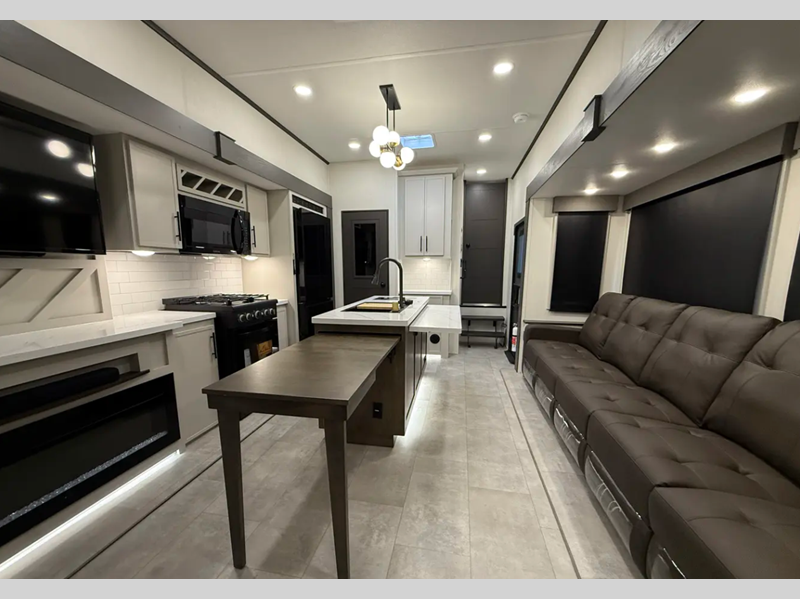 Each luxurious model features real wood cabinet doors, heat rated solid surface countertops throughout, blackout roller shades, and a king-size bed to provide the highest level of owner satisfaction. These fifth wheels also include an electric awning with LED lights outside, as well one-touch auto leveling, doggy d-ring, and a labeled universal docking center to have you set up to camp in no-time!