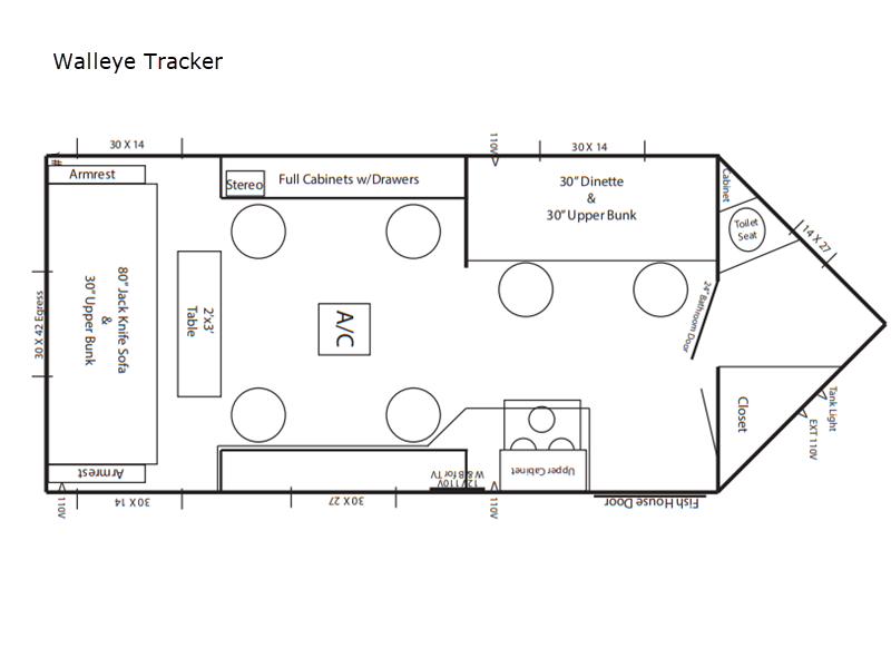 What a fun time you'll have getting away to this Walleye Tracker fish house every chance you get! The 80" jackknife sofa will provide comfortable relaxation as you sit back and drop a line in one of the six fishing holes, and someone else can even be getting lunch prepared a little early since the kitchen has a three-burner cooktop with oven. The 30" dinette will provide a great place to sit down and eat, or you can just sit back and do a little more fishing from this spot.