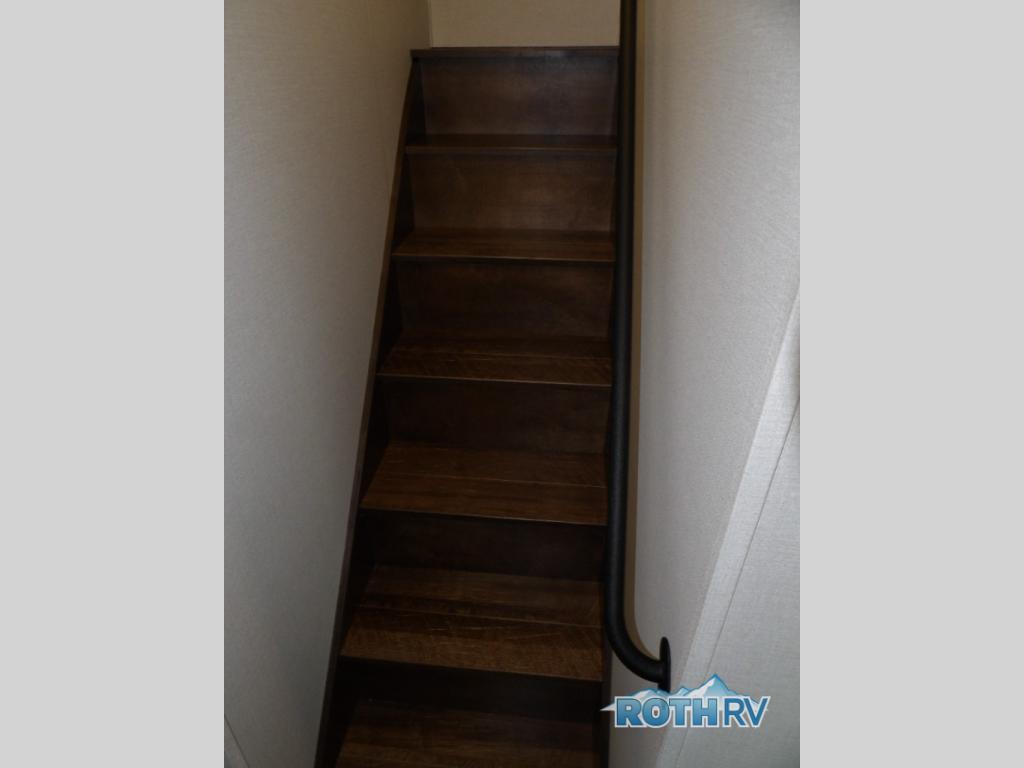 The star feature of this Cedar Creek Cottage destination trailer is the huge loft area. Take the stairs up to the loft to see the three bunk mats and wardrobe. There is also a railing that helps prevent anyone from falling off the edge. The rear private bedroom offers you a king bed slide for the most comfort, and there is also a dresser that you can use to store clothing in. The full bathroom comes with a 30" x 48" fiberglass shower with seat, a large, and a linen closet. You will also have a fully equipped kitchen featuring a pantry, 18 cu. ft. 12-volt refrigerator, 30” stainless over-the-range microwave, and a beautiful island with a sink and fold-down breakfast counter.