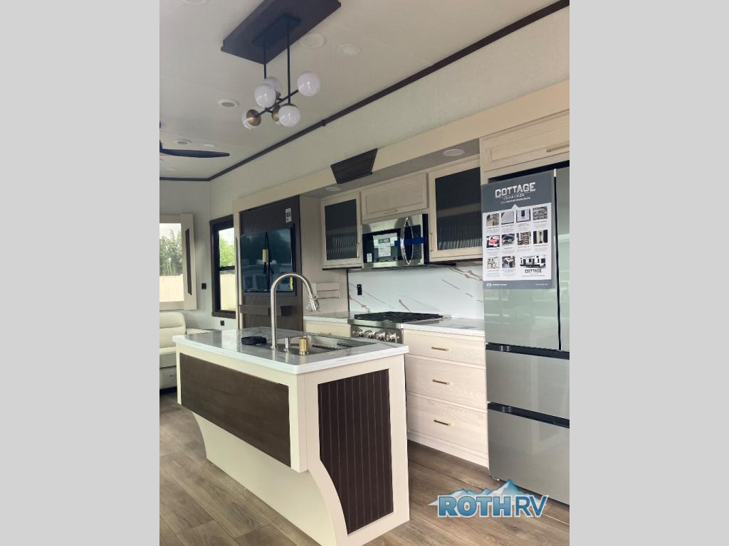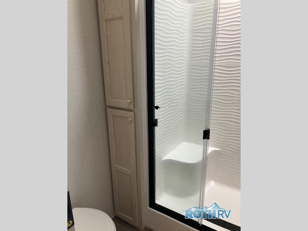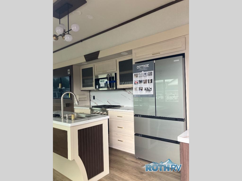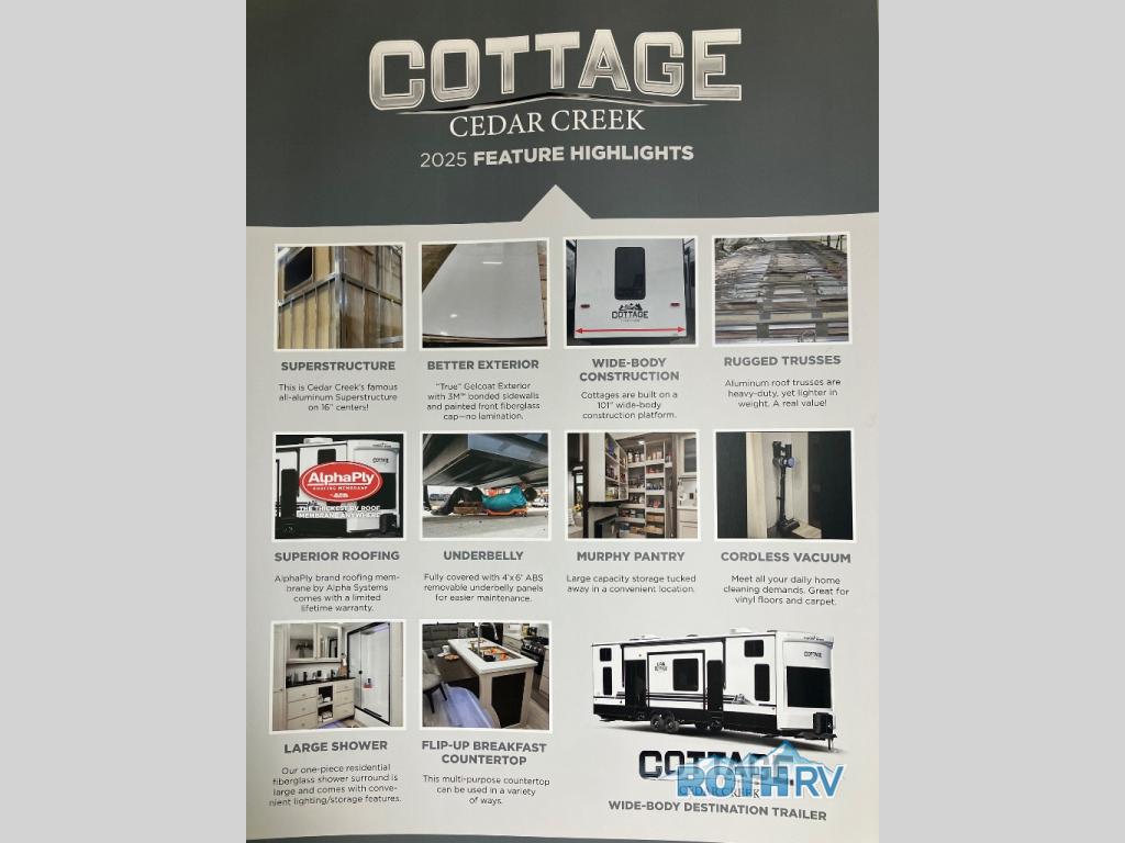 With any Cedar Creek Cottage destination trailer by Forest River, you can enjoy extended stays with residential features at the location of your choice! Each model is built with 3M bonded sidewalls that grow stronger with age and are resistant to UV, heat, oil, moisture, and more. There is also an AlphaPly TPO roof membrane, detachable entry steps, and new waterproof and bug proof Vixenite slide room floor panels for added durability. Head inside where you'll find residential dovetail, self-closing drawers, flush floor slides in the kitchen and living area, a residential style headboard and luxurious bedding decor, and extra storage for linens in the bedroom and bath. Each model is also pre-wired for satellite to the roof, and you can stay connected with the new Cradle Point WiFi/5G antenna and Day 1 connectivity.