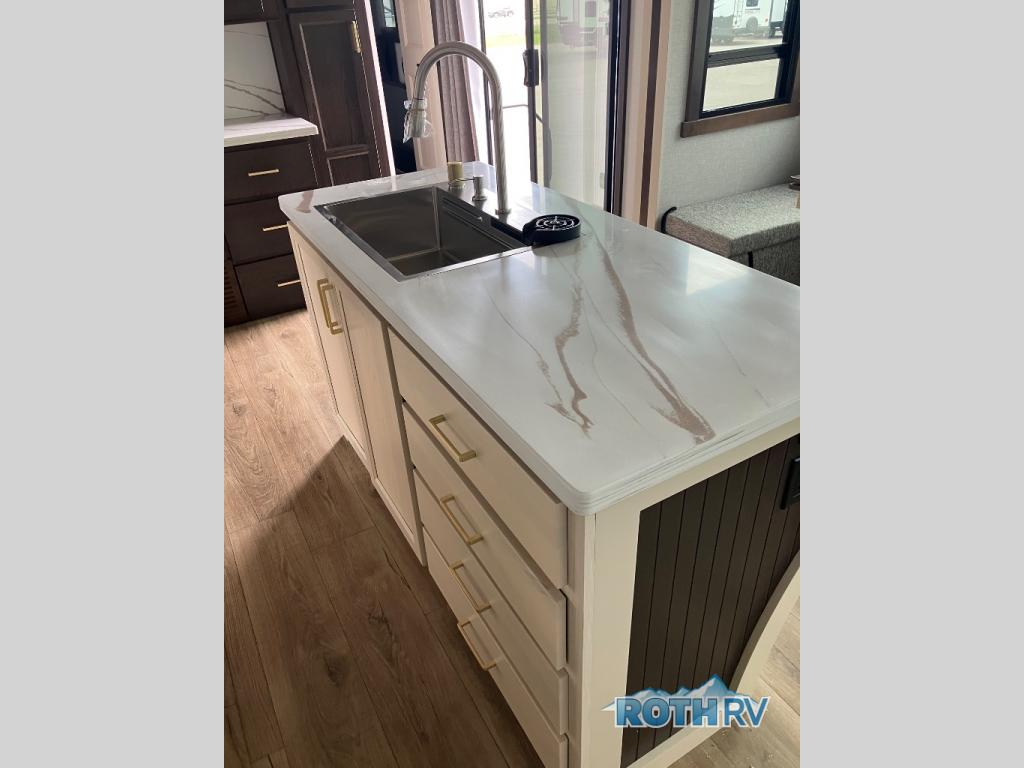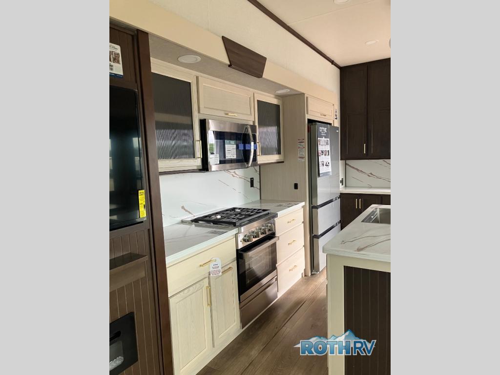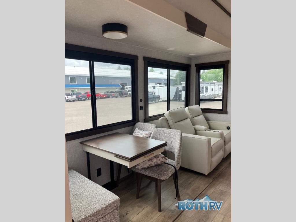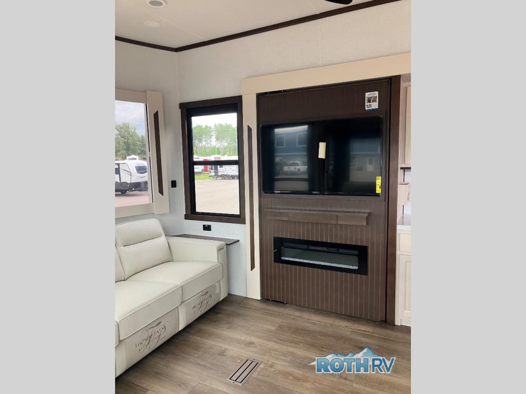 You're sure to feel right at home in this triple slide out destination trailer for four happy campers. The front private bedroom includes a king bed slide out, a large front wardrobe, and a dresser to keep your clothes organized. The full bath includes a shower skylight, extra storage for linens, and a Create-A-Breeze fan to keep air moving. The combined middle kitchen and living area will be a favorite place to visit together with its kitchen island and fold-down breakfast counter, free-standing table with an extension and an ottoman, and power theater seating. There is also a Murphy pantry behind the swivel mounted TV and fireplace for convenient storage, and a hide-a-bed sofa provides guests a place to sleep!