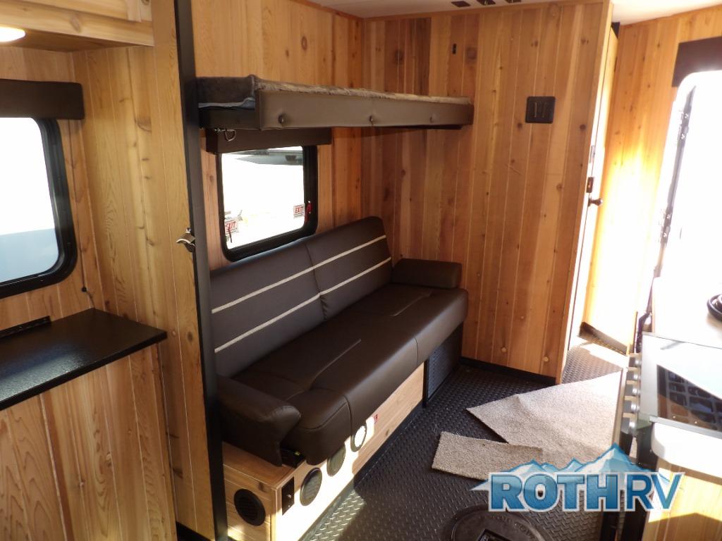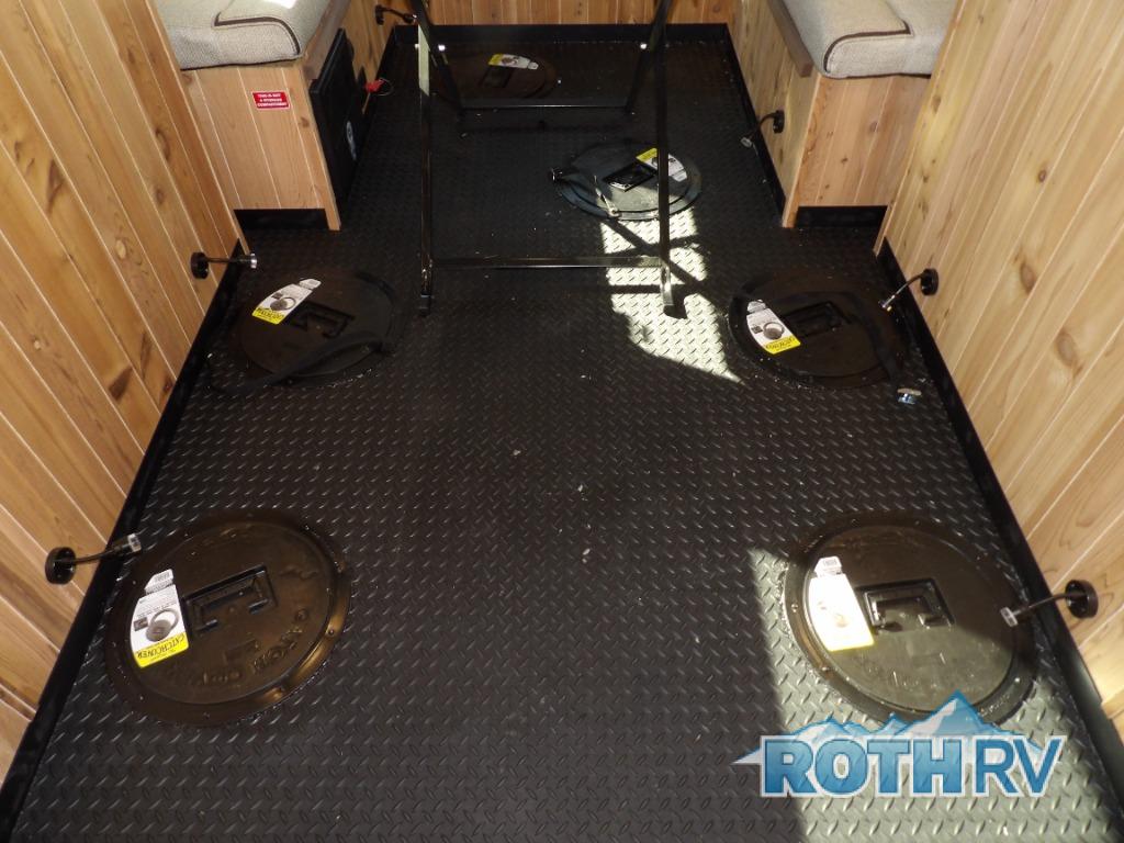 Come experience your next fishing trip in comfort and style with this Cherokee Grey Wolf fish house. You can visit with your family while relaxing on the sofa with a flip-up bunk above or the U-shaped dinette with an electric lift bunk above. When you need a break from fishing, then easily whip up a snack at the cooktop. Throughout this unit you will find overhead cabinets for you to keep things neat and tidy, and with six fishing holes throughout this model, you can easily find your favorite fishing spot!