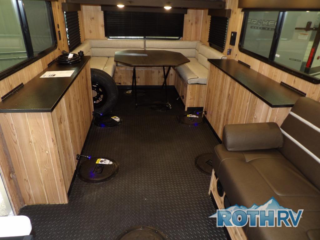 The Cherokee Grey Wolf fish houses by Forest River are constructed with a fully walkable residential trussed roof system, dual pane windows, and a thermofoil wrapped roof for additional insulation. You will also find a heavy duty rubber floor, a diamond plate exterior base, and a V-nose design for better towability. There is convenient rod storage inside, along with multiple fishing holes, LED fishing hole lights, and a 12V refrigerator!
