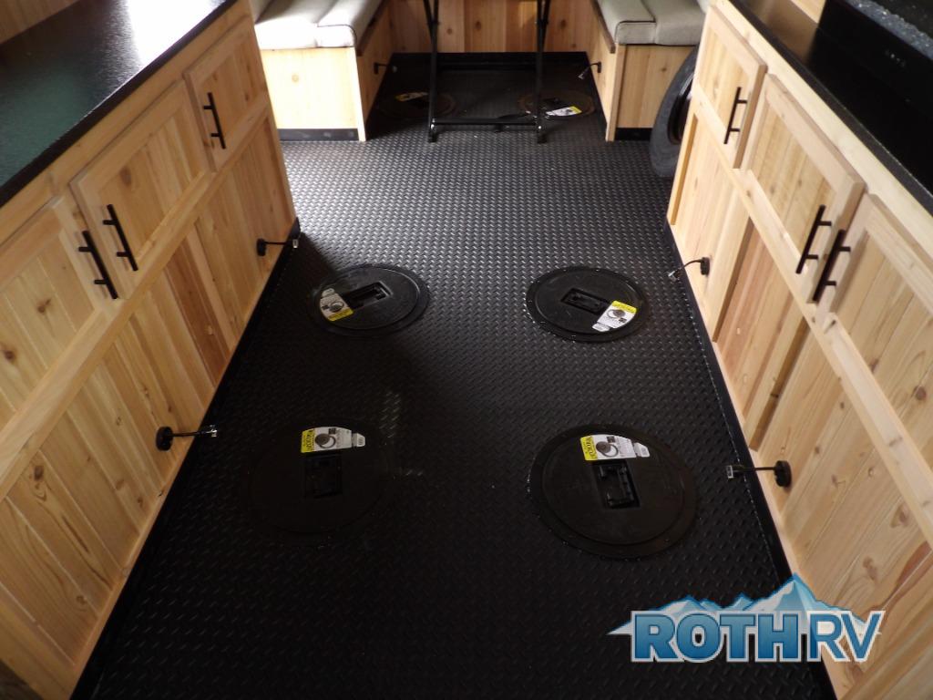 The Cherokee Grey Wolf fish houses by Forest River are constructed with a fully walkable residential trussed roof system, dual pane windows, and a thermofoil wrapped roof for additional insulation. You will also find a heavy duty rubber floor, a diamond plate exterior base, and a V-nose design for better towability. There is convenient rod storage inside, along with multiple fishing holes, LED fishing hole lights, and a 12V refrigerator!