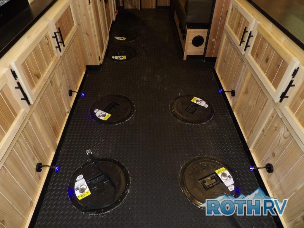 The Cherokee Grey Wolf fish houses by Forest River are constructed with a fully walkable residential trussed roof system, dual pane windows, and a thermofoil wrapped roof for additional insulation. You will also find a heavy duty rubber floor, a diamond plate exterior base, and a V-nose design for better towability. There is convenient rod storage inside, along with multiple fishing holes, LED fishing hole lights, and a 12V refrigerator!