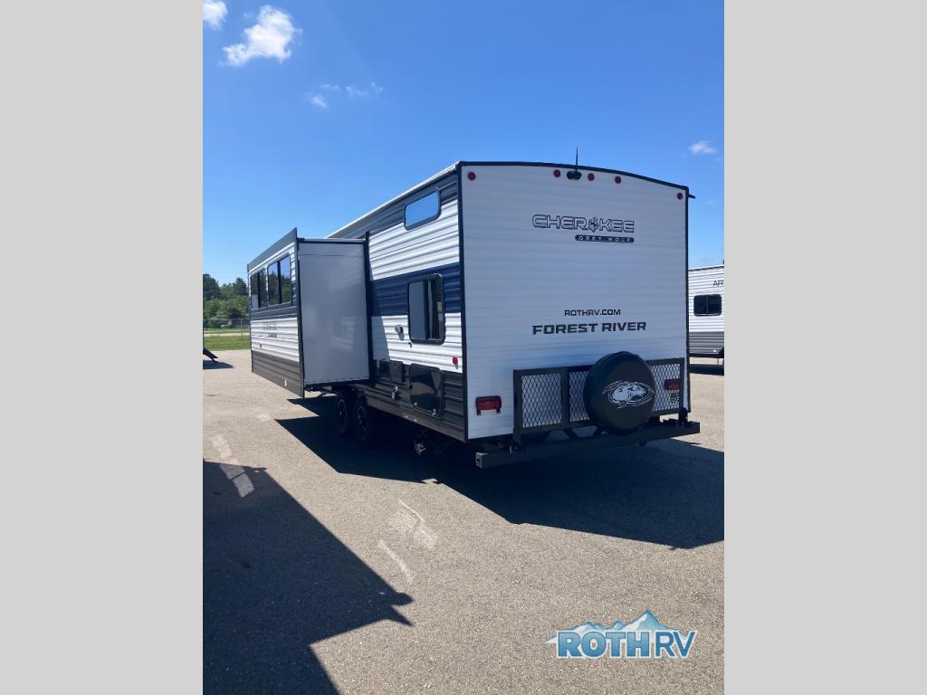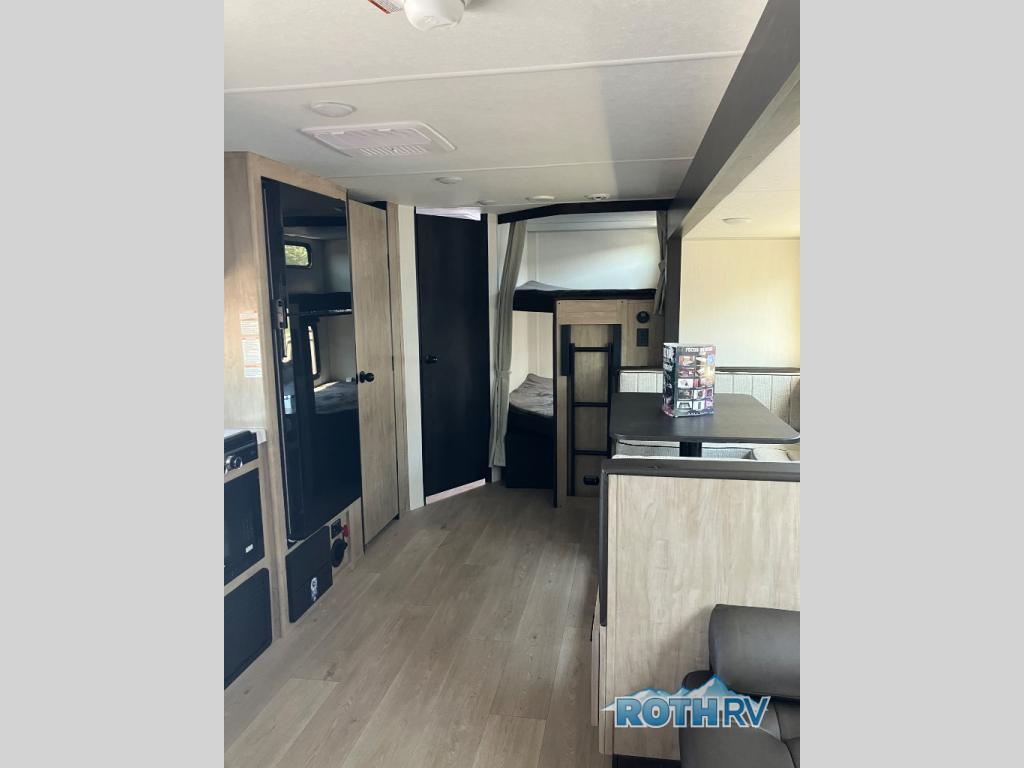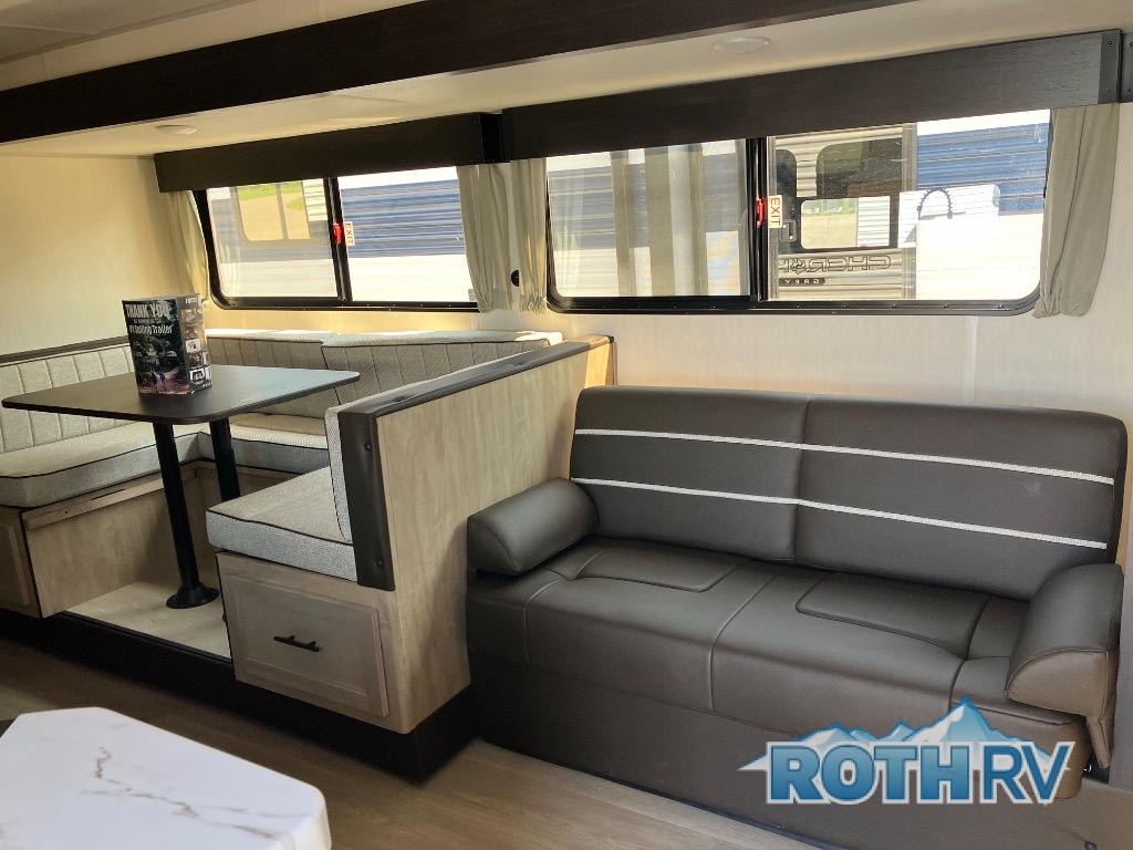 Come on inside this Cherokee Grey Wolf travel trailer and experience the convenience of a smooth flow of traffic in and out with two entry doors. The rear door leads into a full bath which is great for accessibility. Once inside, you will notice the large U-shaped dinette and the sofa which sit on the slide and create a spacious footprint for moving about, as well as great places to play games and socialize with your friends and family. A walk-in pantry provides plenty of storage allowing you to stock up on your favorite snacks and dry goods for your family adventure. At night, there is sleeping space for everyone between the double-size bunks and the RV king bed, plus the furniture.