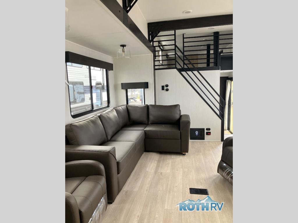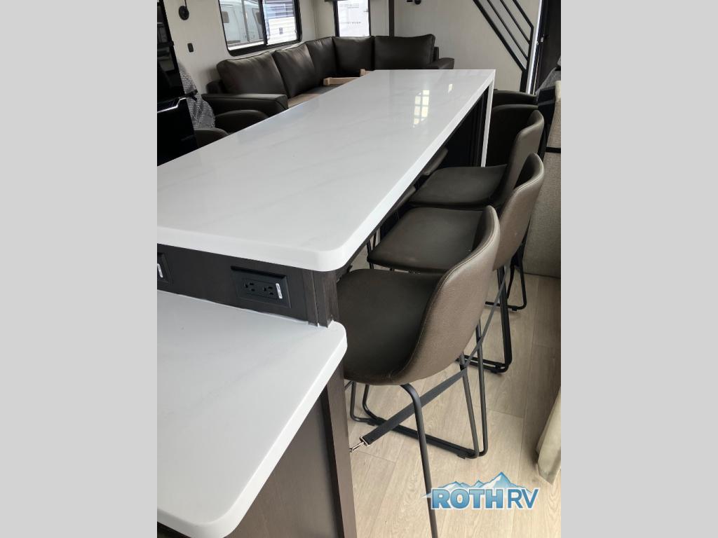 Time spent in this destination trailer will be time well spent! You will appreciate dual entry doors for maximum convenience, plus a spacious full bath that is close by the front private bedroom! Your crew can relax in the middle living area on the L-shaped sofa, and there are two lounge chairs for even more seating spaces. The rear kitchen will be any chef's dream with its island with six stools and all the appliances to create meals each day. This model also features triple slides so you can enjoy more space to relax!