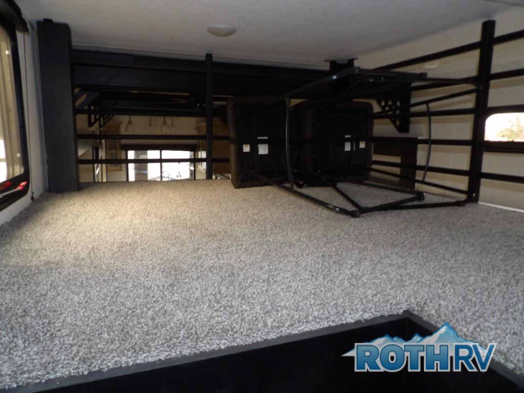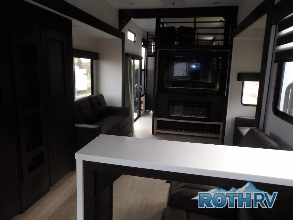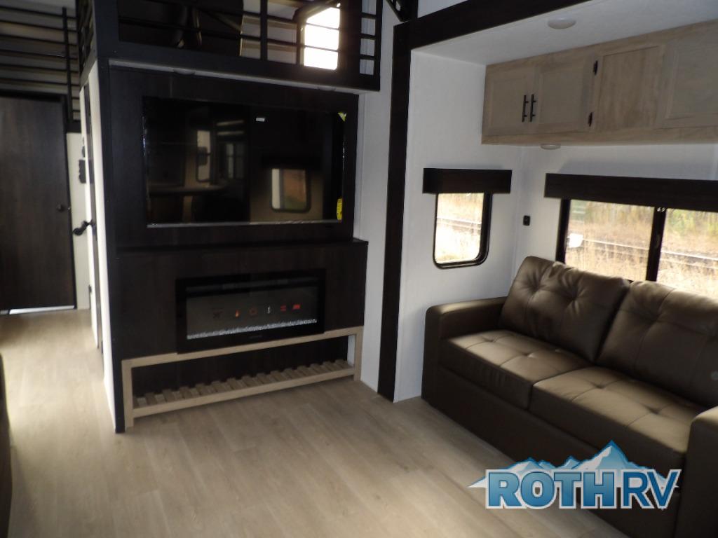 It won't be hard to find comfort in this front kitchen destination trailer! There is ample counter space to prep meals, a free-standing dinette with a slide out, plus a large pantry and 18 cu. ft. refrigerator for food storage. The bar top with stools overlooks the middle living area, where you'll also find dual hide-a-bed sofas and an entertainment center with a fireplace. The full bath includes a shower with a seat for more comfort, and one of the dual entry doors is right across from the bath so you can quickly get back outside. Head up the steps to the dual loft areas with two bunk mats and cabinets on one side, and an open area on the other, perfect for a play room or extra storage! And under the loft you'll find the rear private bedroom with a king bed slide, a wardrobe and an entertainment center, plus washer and dryer prep if you want to add these appliances!