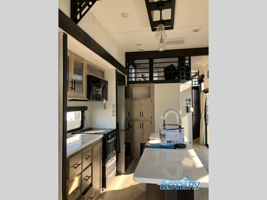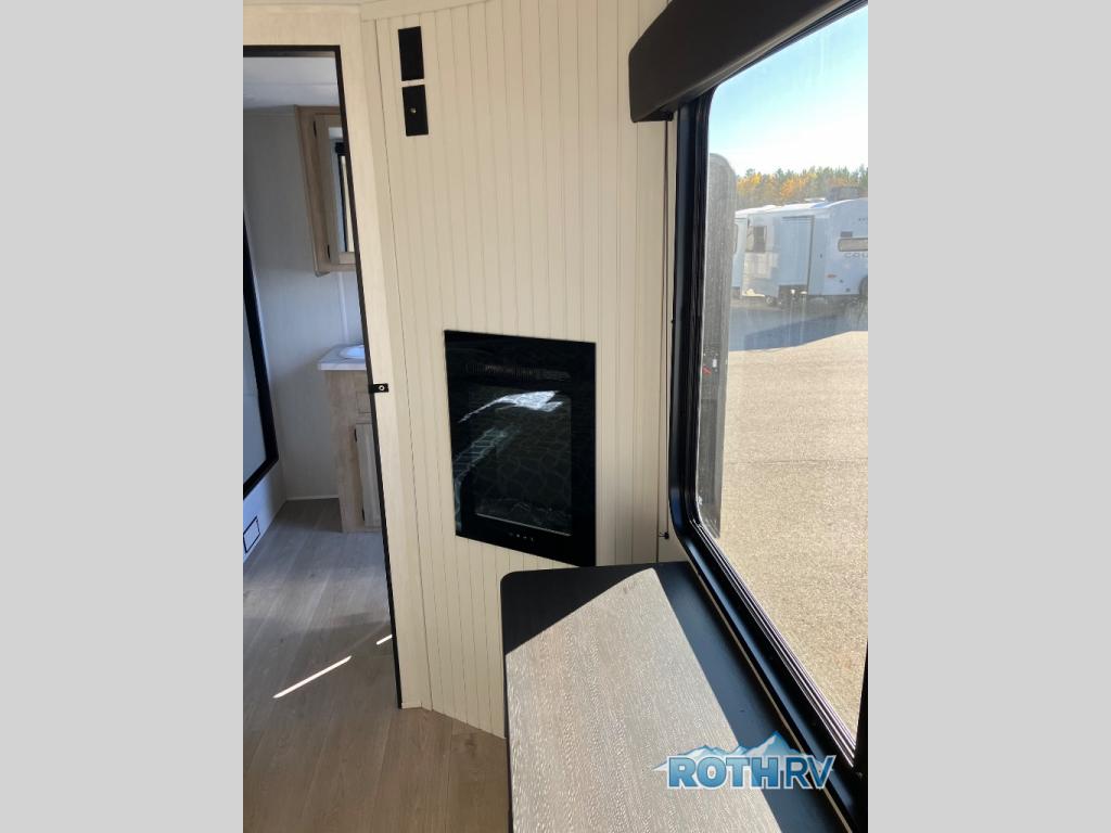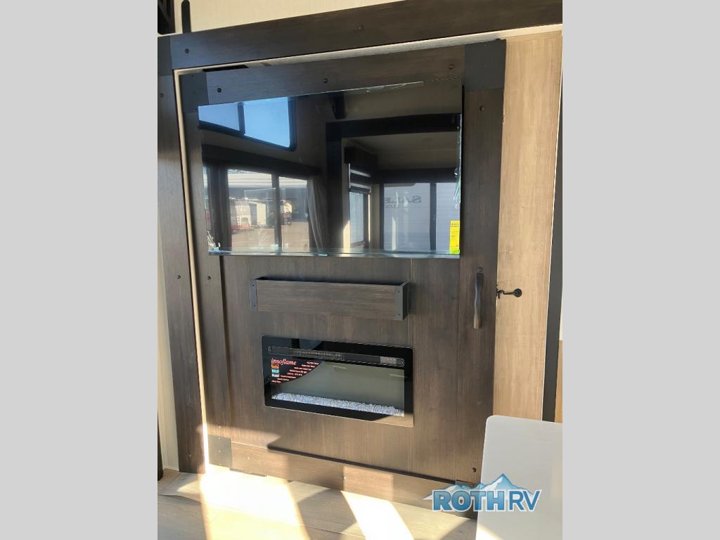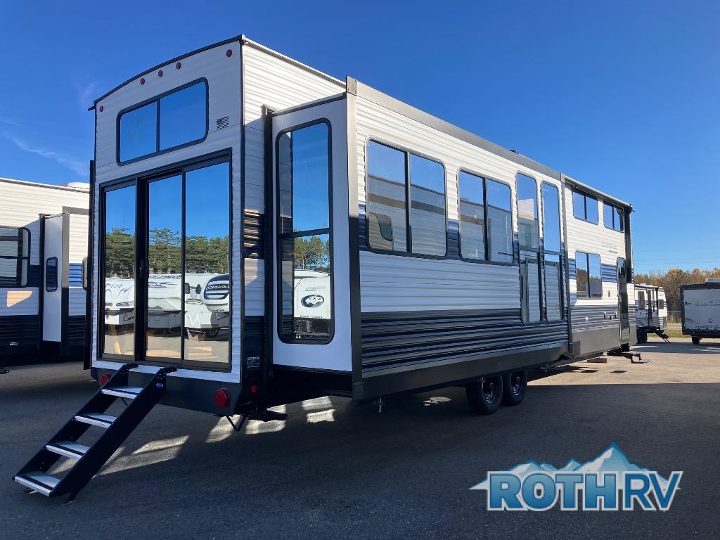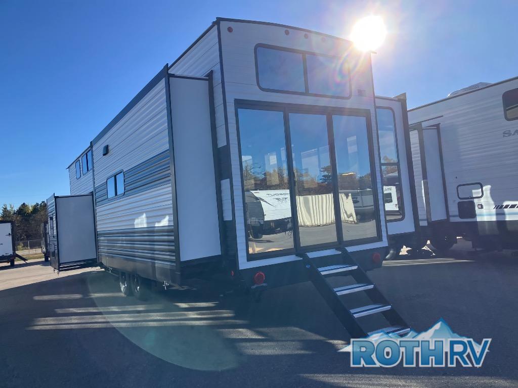 Choosing this destination trailer as your next RV won't be a hard decision! You can enter in through the front bath that includes dual bath sinks, a shower with a seat, and a medicine cabinet for your necessities. The master bedroom is connected to this bath for added convenience, and you're sure to enjoy the bedroom fireplace and king bed slide out. Just outside this room are the stairs that lead to the loft where you'll find two queen-size beds on one side and an open area where the kids can play or to use as storage. A second full bath is found next the stairs on the lower level, and there is a wardrobe with washer/dryer prep if you want to add these appliances. Everyone will love to join together and visit in the combined kitchen and living room. Here, you'll find a free-standing dinette, an L-shaped sofa, a kitchen island with two chairs, plus an entertainment center with a fireplace! The hidden pantry behind the fireplace will let you keep food stocked, and the rear patio doors will let natural light in!