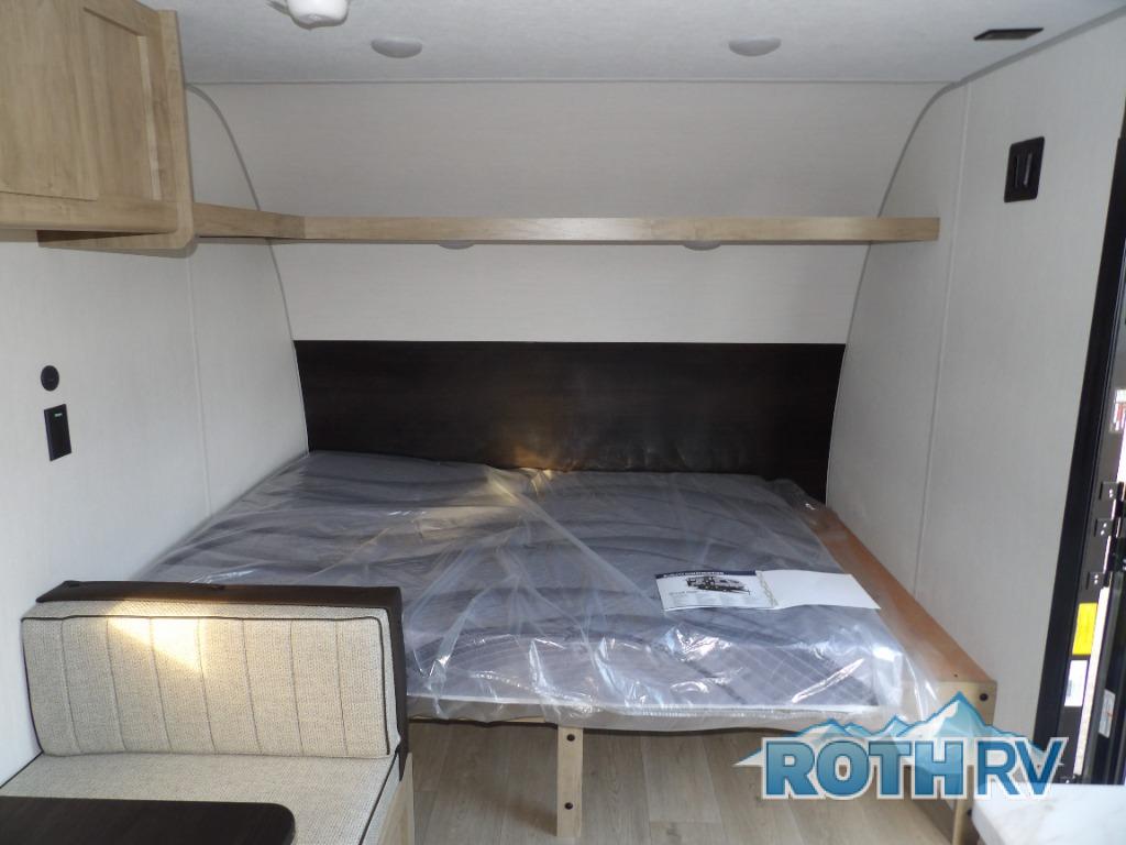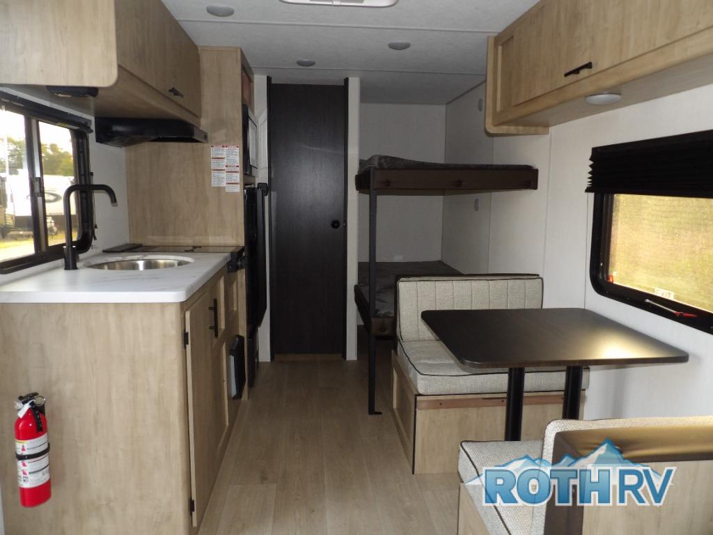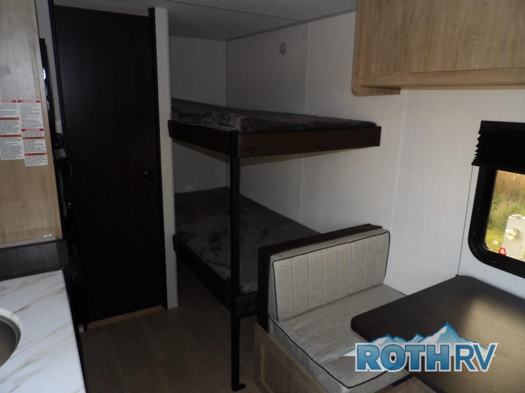 The whole family can sleep comfortably in this travel trailer! It has a set of bunk beds for the kids to sleep on, and you can sleep comfortably on the front queen bed with overhead cabinets and a shelf. The chef will enjoy preparing their best home cooked meals with the high output cooktop, and you can dine at the booth dinette. And the private bath onboard means you won't have to leave your camper in the middle of the night!