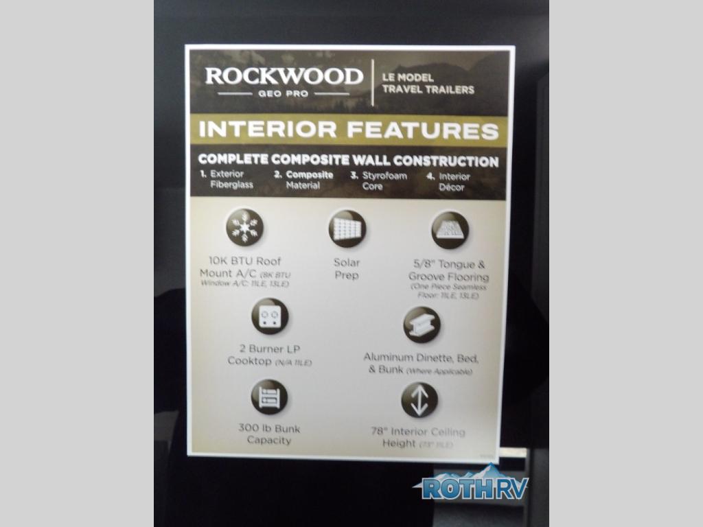 With any Rockwood GEO Pro LE travel trailer by Forest River you will enjoy easy towing, durable construction, and off-road capabilities with a fully laminated roof! Each model is constructed with complete composite wall construction for added strength and durability, and Dexter® axles that will make towing easier than ever. You will also enjoy MORryde Solid, Supported Steps for more stability and security when going inside your travel trailer. Inside, you'll find back up camera prep for added security, plus many other interior amenities that will make you feel at home on the road.