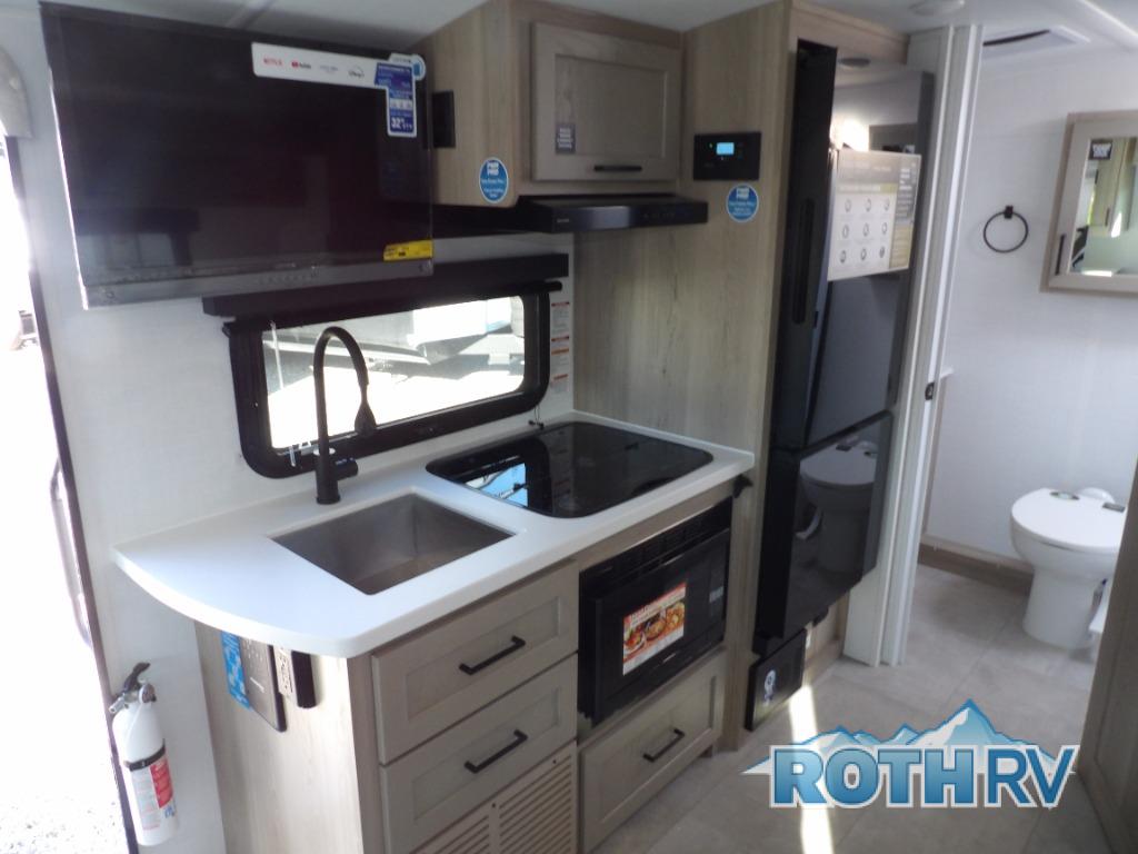 This travel trailer will feel more like home with its front bedroom and walk-around full-size bed. You'll enjoy the 12V TV as you relax on the 72" sofa with a table and cupholders. The full rear bath includes a spacious shower to clean up in each day and there is a linen closet for clean towels. When you're ready to prepare dinner you'll have a three burner cooktop and microwave oven indoors! And don't forget the exterior storage allows you to bring along beach toys and tackle boxes. The optional Power Package available on this model includes three 200W solar panels, a side solar plug-in, a 3kW 160A inverter, and more off-grid features!