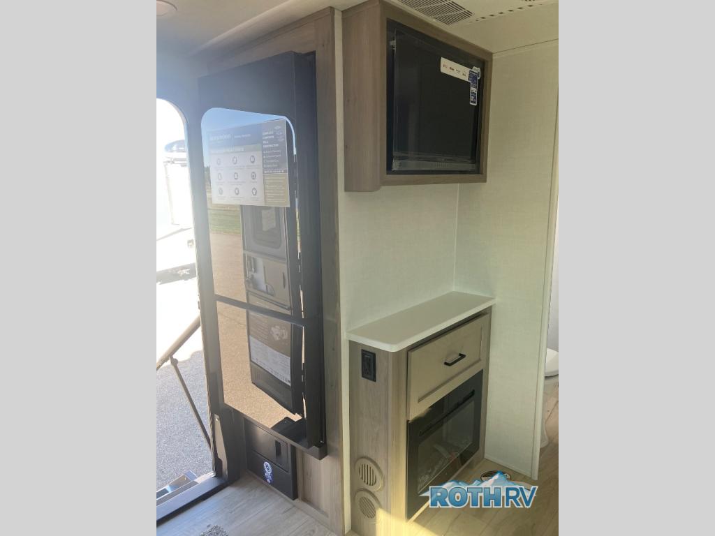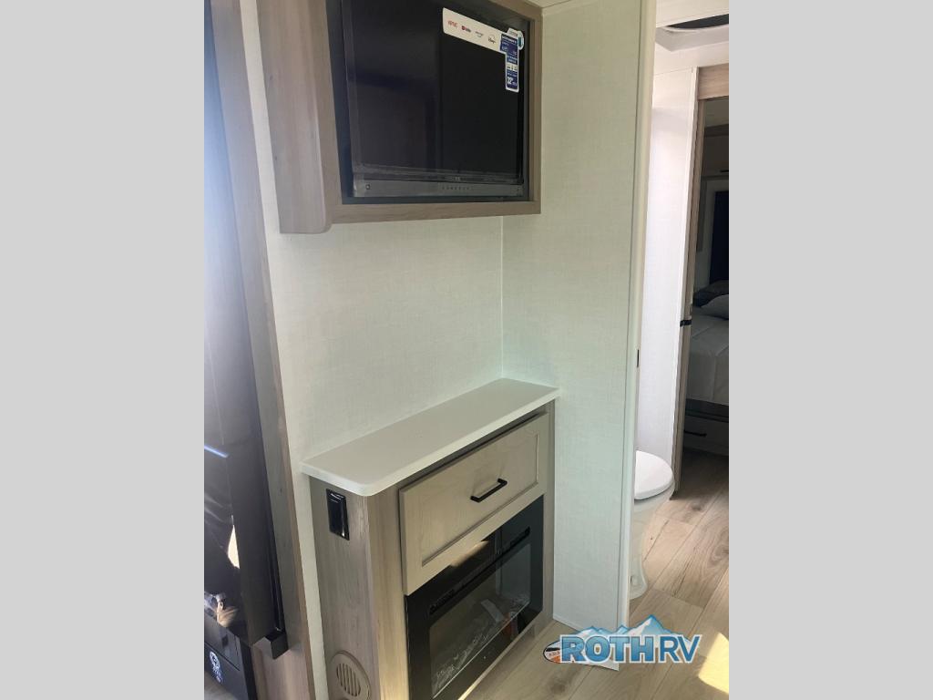 If you like the front kitchen layout, you're going to love this one! You'll have plenty of counter space to prepare and cook meals, or you may just want to head outdoors to cook on the outside griddle. There is a 19' power awning with LED lights to keep you protected from the sun and rain, and there are three exterior storage compartments for lawn chairs, fishing poles, and firewood! This model includes a U-shaped dinette slide in perfect view of the 12V smart entertainment TV and fireplace, and this area can double as your guests' sleeping space at night. You'll stay comfortable in the rear bedroom that includes an RV queen bed, dual bedroom wardrobes, and an optional TV if you enjoy movies in bed!