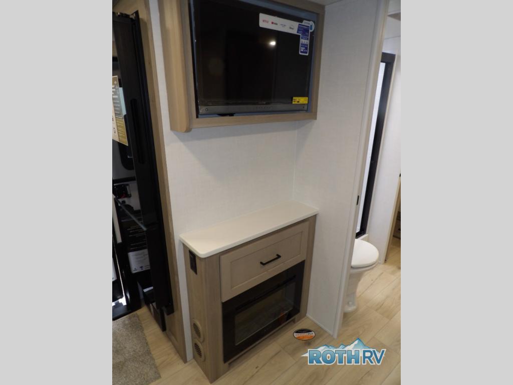 If you like the front kitchen layout, you're going to love this one! You'll have plenty of counter space to prepare and cook meals, or you may just want to head outdoors to cook on the outside griddle. There is a 19' power awning with LED lights to keep you protected from the sun and rain, and there are three exterior storage compartments for lawn chairs, fishing poles, and firewood! This model includes a U-shaped dinette slide in perfect view of the 12V smart entertainment TV and fireplace, and this area can double as your guests' sleeping space at night. You'll stay comfortable in the rear bedroom that includes an RV queen bed, dual bedroom wardrobes, and an optional TV if you enjoy movies in bed!