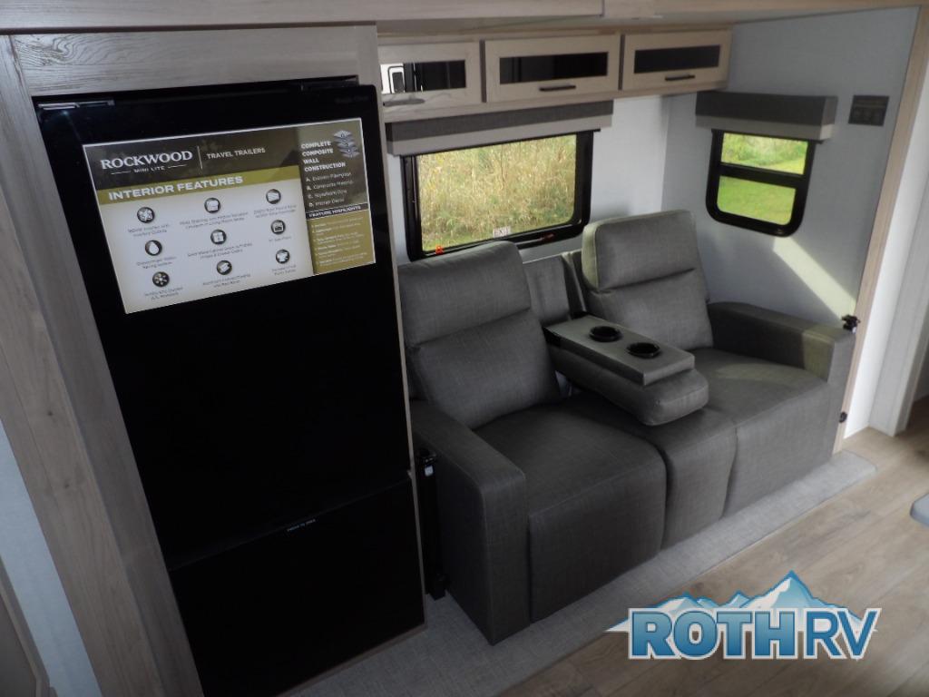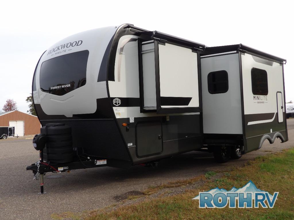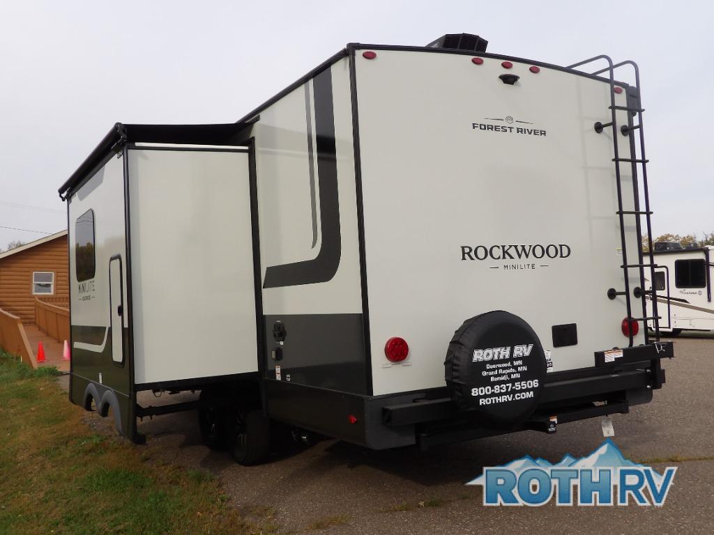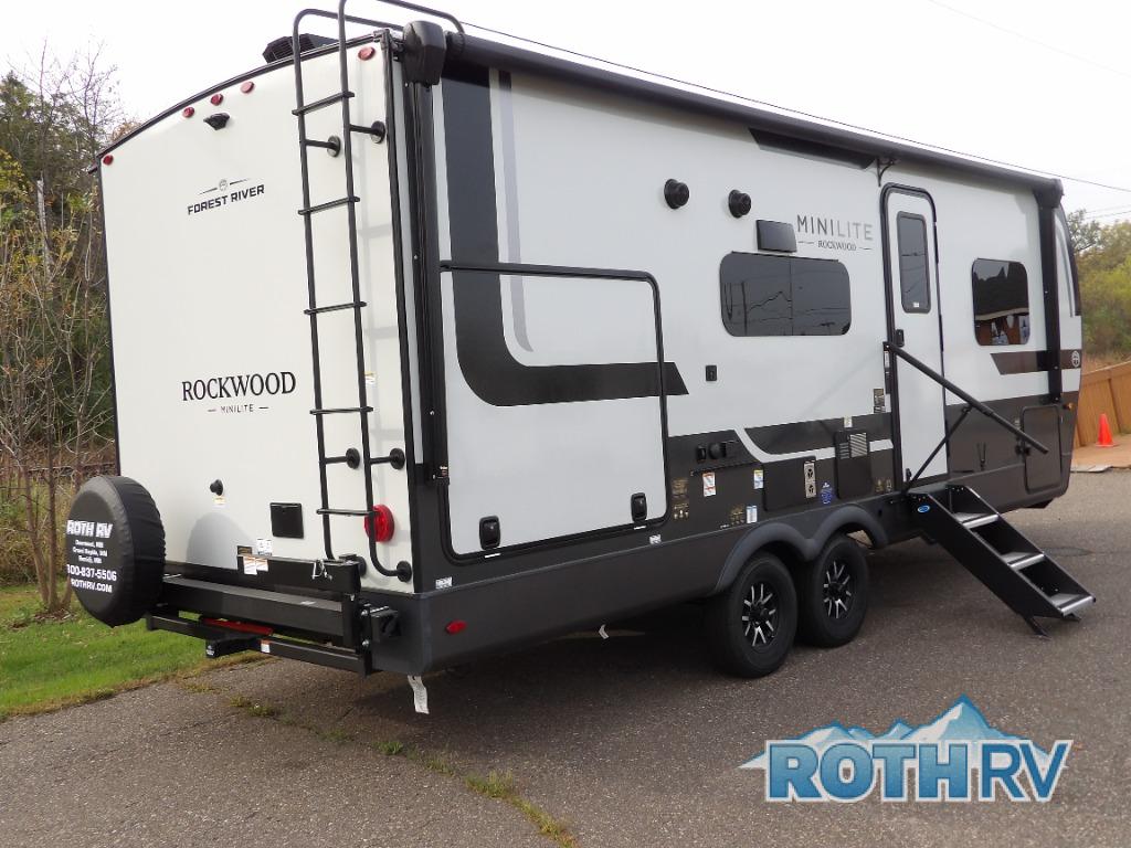Each Rockwood Mini Lite travel trailer by Forest River is constructed with a fully laminated one-piece walkable roof, sleek frameless windows, and a six-sided full aluminum frame for strength and durability. The 12V thermostatically controlled heated tanks, plus radiant foil in the underbelly will allow you to camp well into the colder months, and the 200W roof solar panel will be perfect for a little off-gridding. Each model includes solid surface kitchen countertops, hidden hinge cabinet doors, roller shades, plus many more interior features. Having an AIR 360+ omnidirectional antenna with WiFi prep on board gives you the option to get some work done if it's needed, and the power tongue jack provides hassle-free set up, so you can enjoy more time relaxing!