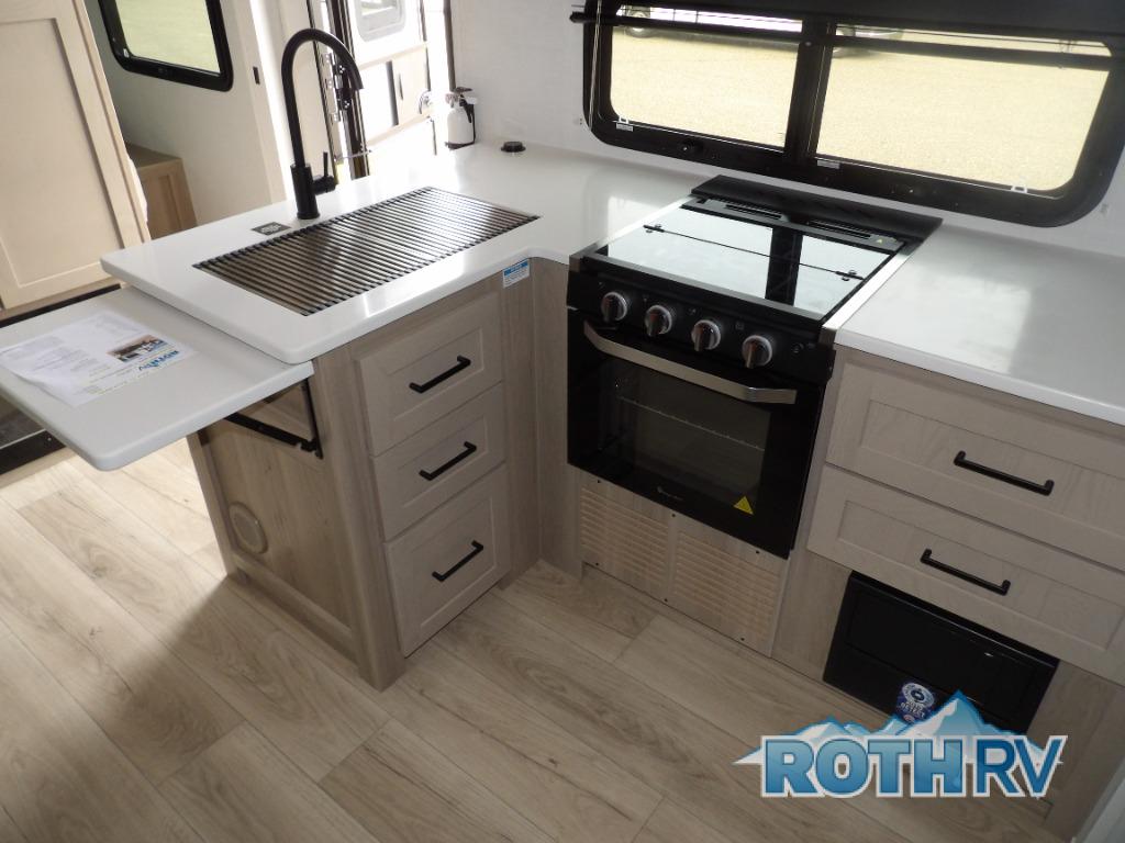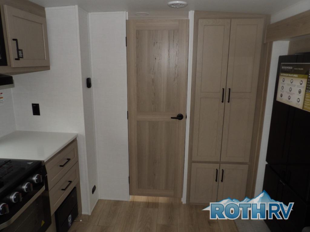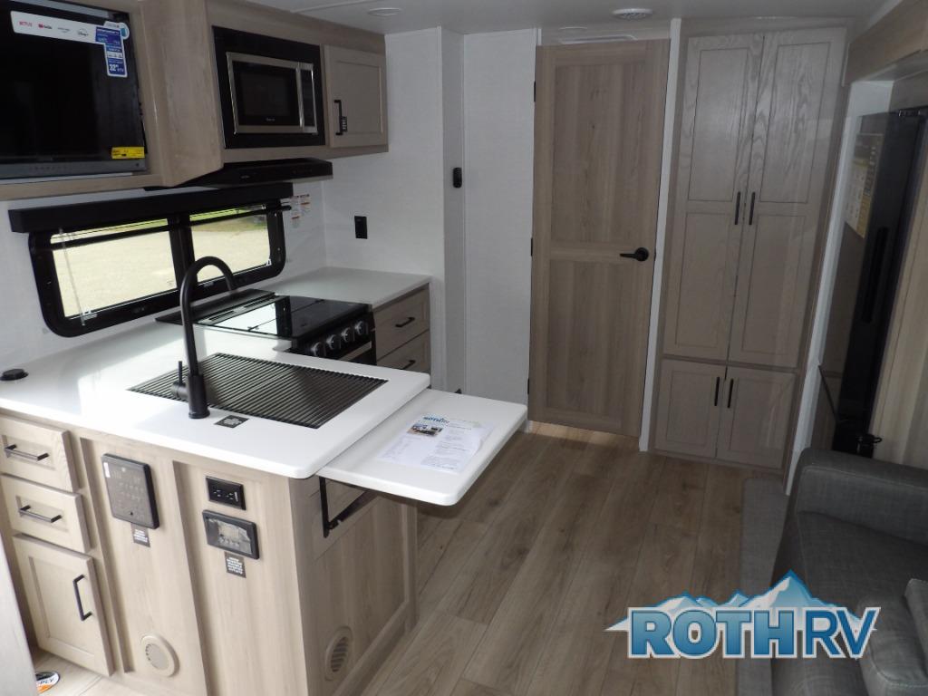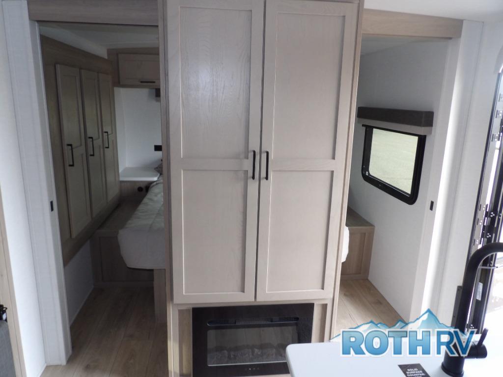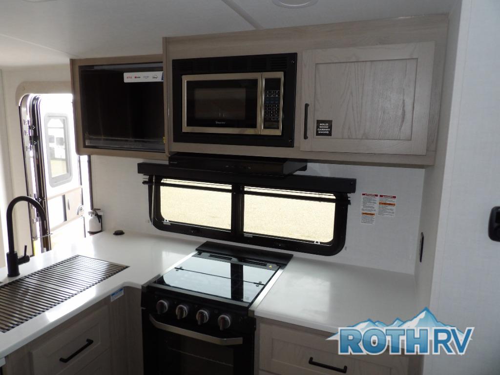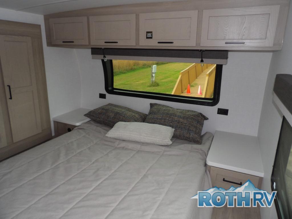 This is the perfect travel trailer for two people looking for comfortable camping trips! You will have your own RV queen bed to sleep on in the front private bedroom, and an optional TV can be added if you enjoy the morning news in bed. Breakfast can be made on the three burner cooktop, or head outdoors to cook on the outside kitchen. The theater seating with a table will provide a place to relax and dine together, and the spacious full rear bath will allow you to clean up before you head out for the day. This model includes plenty of storage space, including two pantries, a wardrobe slide out in the bedroom, plus a drop-frame pass-through storage for larger camp gear!