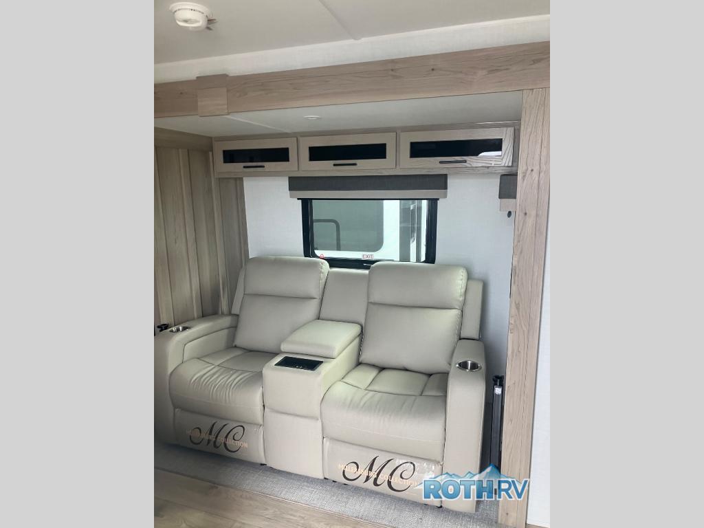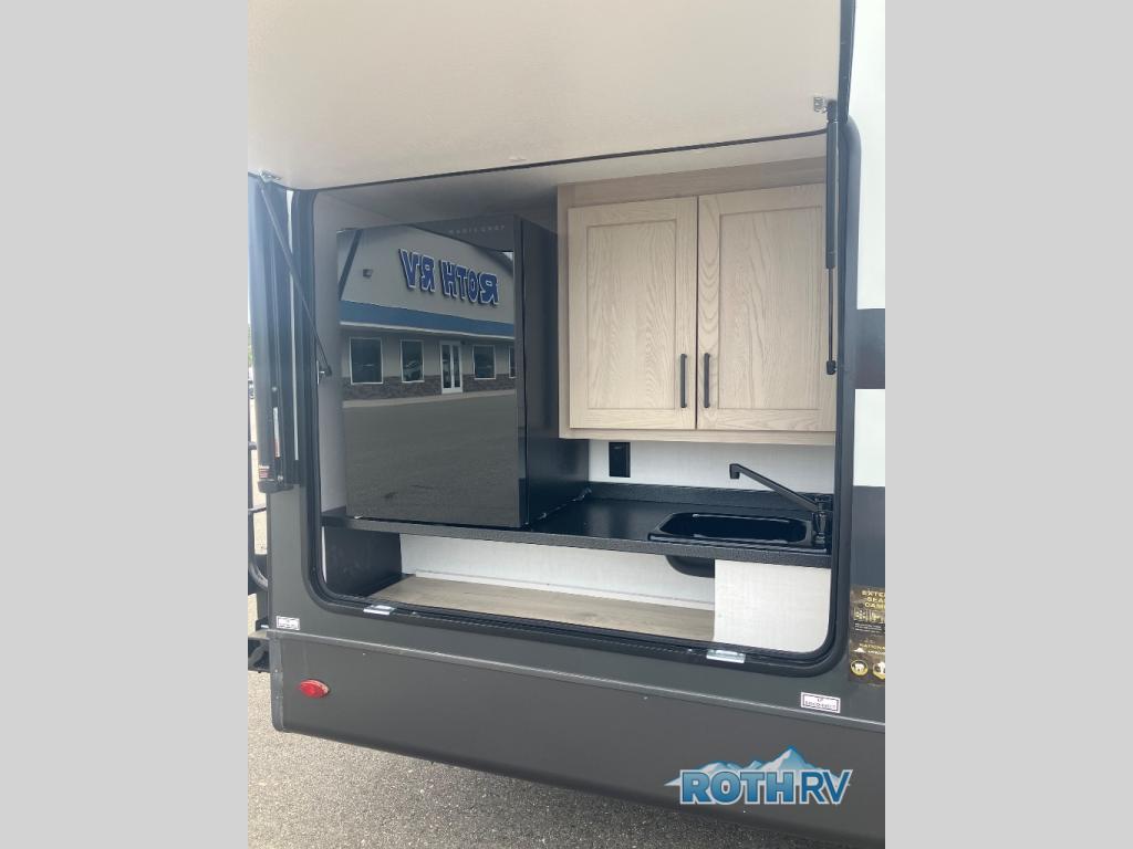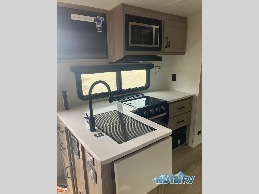 This is the perfect travel trailer for two people looking for comfortable camping trips! You will have your own RV queen bed to sleep on in the front private bedroom, and an optional TV can be added if you enjoy the morning news in bed. Breakfast can be made on the three burner cooktop, or head outdoors to cook on the outside kitchen. The theater seating with a table will provide a place to relax and dine together, and the spacious full rear bath will allow you to clean up before you head out for the day. This model includes plenty of storage space, including two pantries, a wardrobe slide out in the bedroom, plus a drop-frame pass-through storage for larger camp gear!