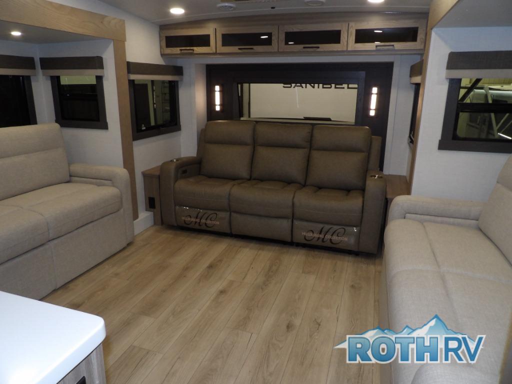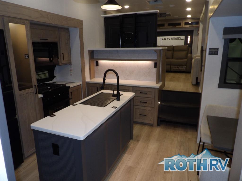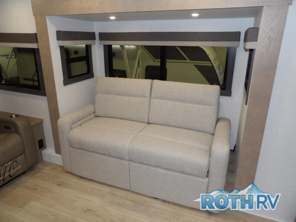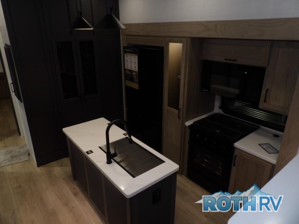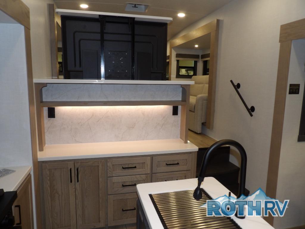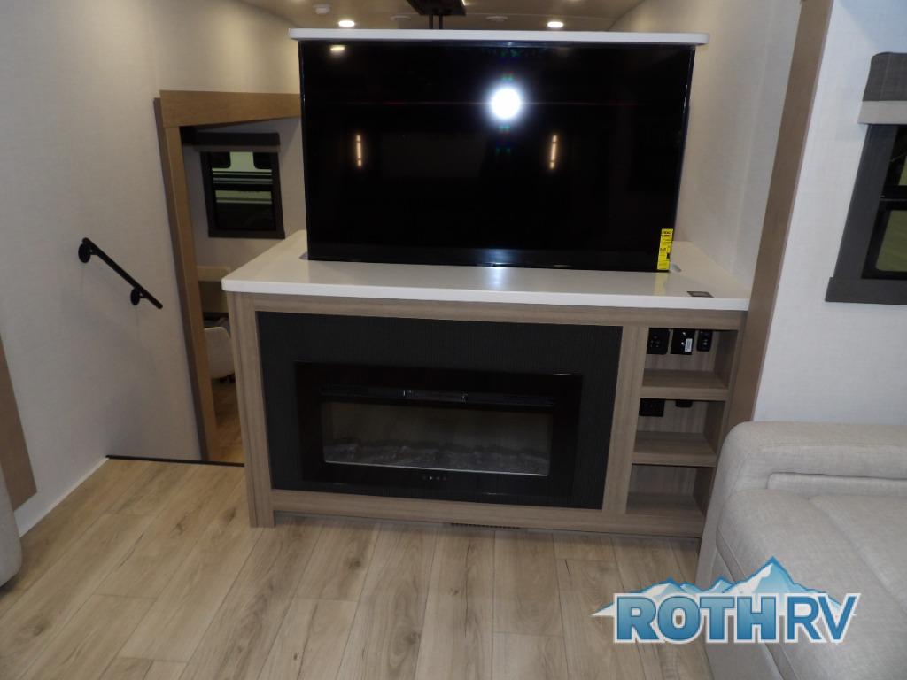 This fifth wheel is designed for comfort, connection, and relaxation on the road. The 72" x 80" king bed in the bedroom offers a spacious and restful retreat after a long day. Mealtime is a time to gather, and the rotating table with chairs creates the perfect setting to sit down, share stories, and reflect on the day’s adventures. For more laid-back evenings, the front living area features a Televator TV, turning the space into a cozy home theater for movie nights with the whole crew. When it’s time to wind down, two 68" hide-a-beds provide additional sleeping space, ensuring everyone has a comfortable place to rest.