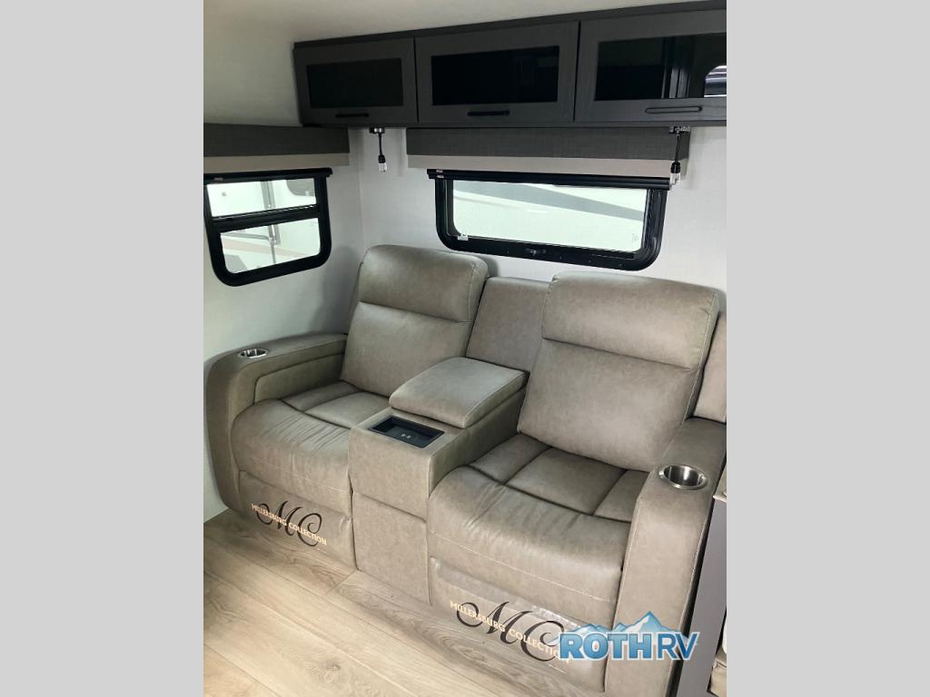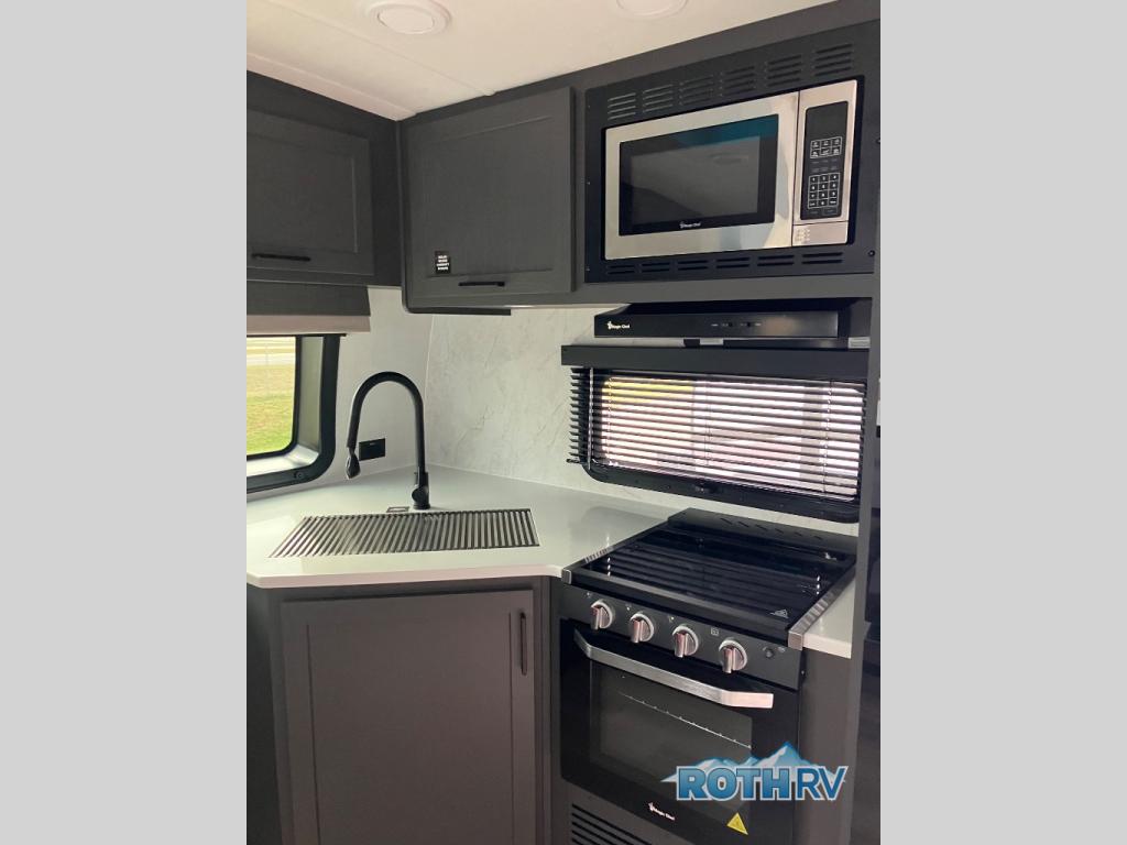 When you are outside this trailer you can enjoy the protection from the 21' power awning, you will also find exterior storage for your extra gear, and a ladder at the rear. You get to choose which entrance to step up into, be it the spacious rear bedroom with a queen bed slide and a wardrobe, or the main entry into the kitchen and living area. The furniture slide includes a booth dinette to eat your meals at, and theater seating to watch the Smart TV with a fireplace below. And the cook will love the front kitchen with extra counter space, a three-burner range, plus a 12V refrigerator and pantry for food storage!