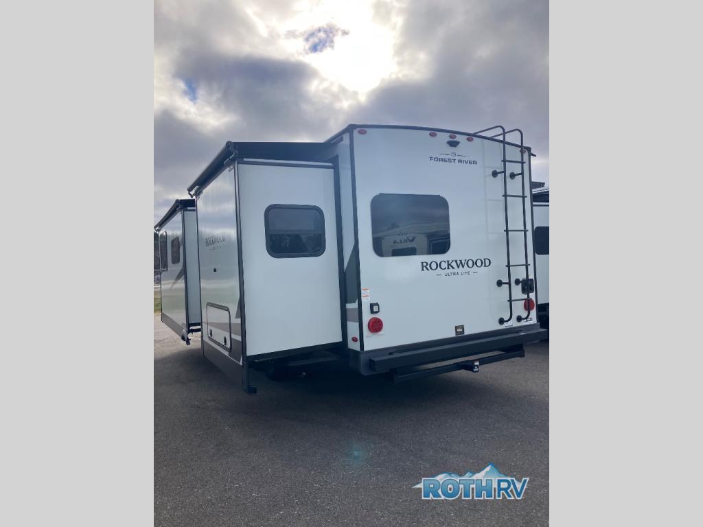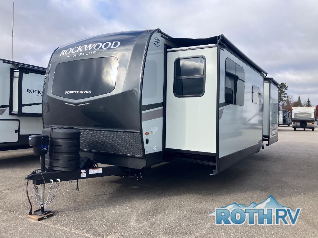 Each Rockwood Ultra Lite travel trailer by Forest River includes superior construction with a high gloss fiberglass cap, aluminum cage construction, and a power awning with LED lighting for a cozy and functional outdoor space. The torsion axle, power tongue jack will make towing smooth and hassle-free, along with the nitrogen filled, Goodyear Endurance tires and the tire pressure monitor system. Interior comforts include kitchen sink with high rise faucet, hidden hinge cabinet doors, and roller shades to name a few. Choose a Rockwood Ultra Lite travel trailer today!