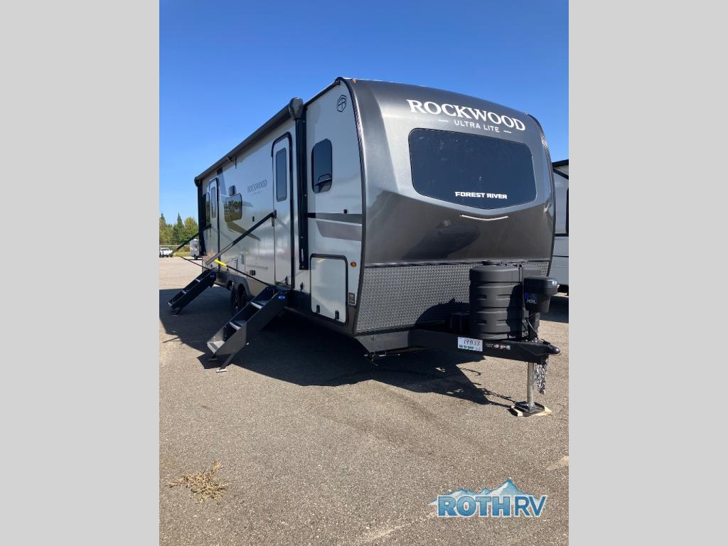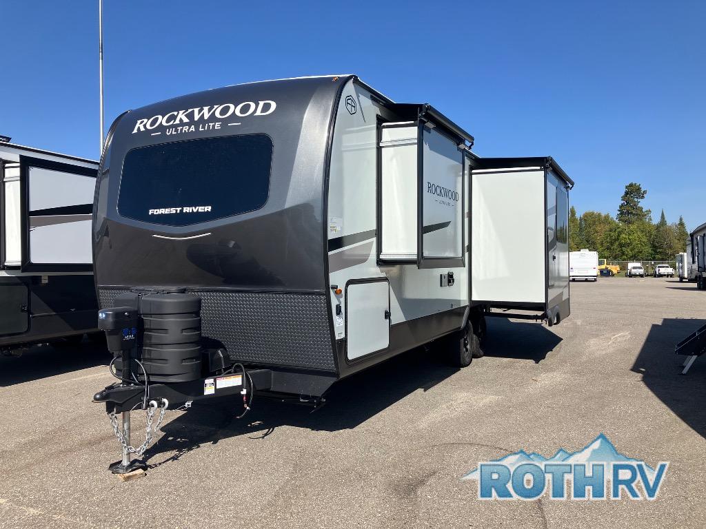 Each Rockwood Ultra Lite travel trailer by Forest River includes superior construction with a high gloss fiberglass cap, aluminum cage construction, and a power awning with LED lighting for a cozy and functional outdoor space. The torsion axle, power tongue jack will make towing smooth and hassle-free, along with the nitrogen filled, Goodyear Endurance tires and the tire pressure monitor system. Interior comforts include kitchen sink with high rise faucet, hidden hinge cabinet doors, and roller shades to name a few. Choose a Rockwood Ultra Lite travel trailer today!