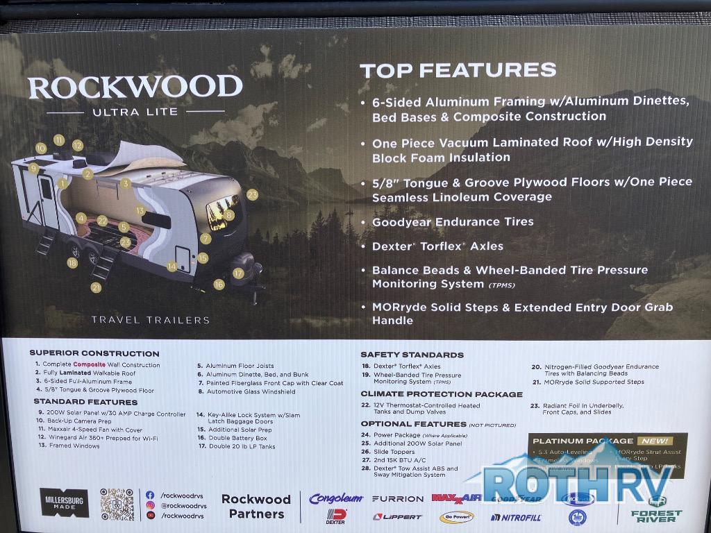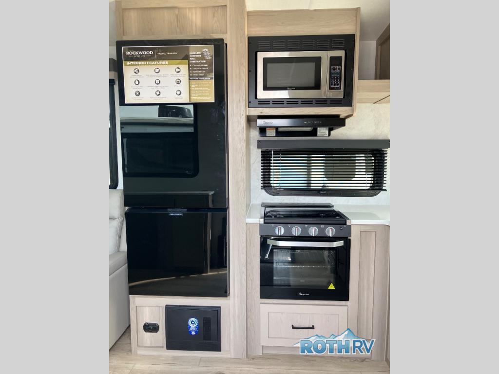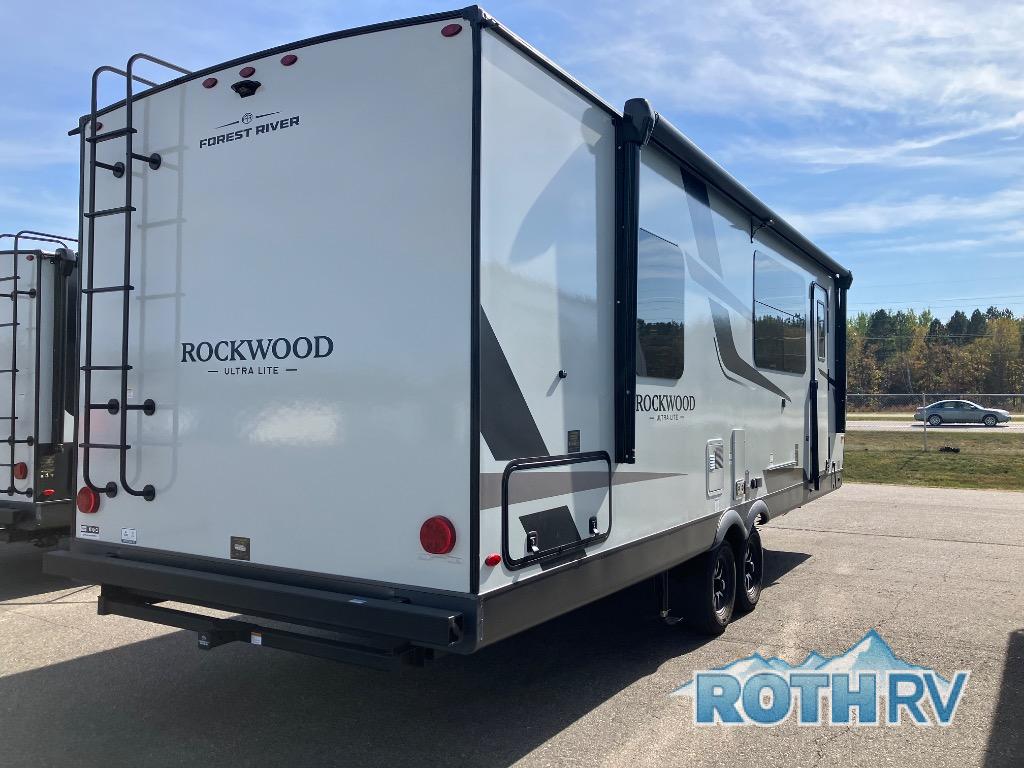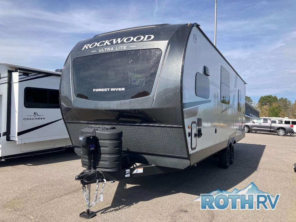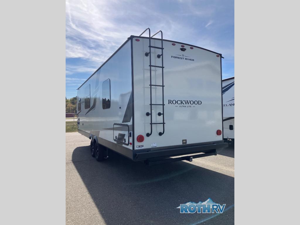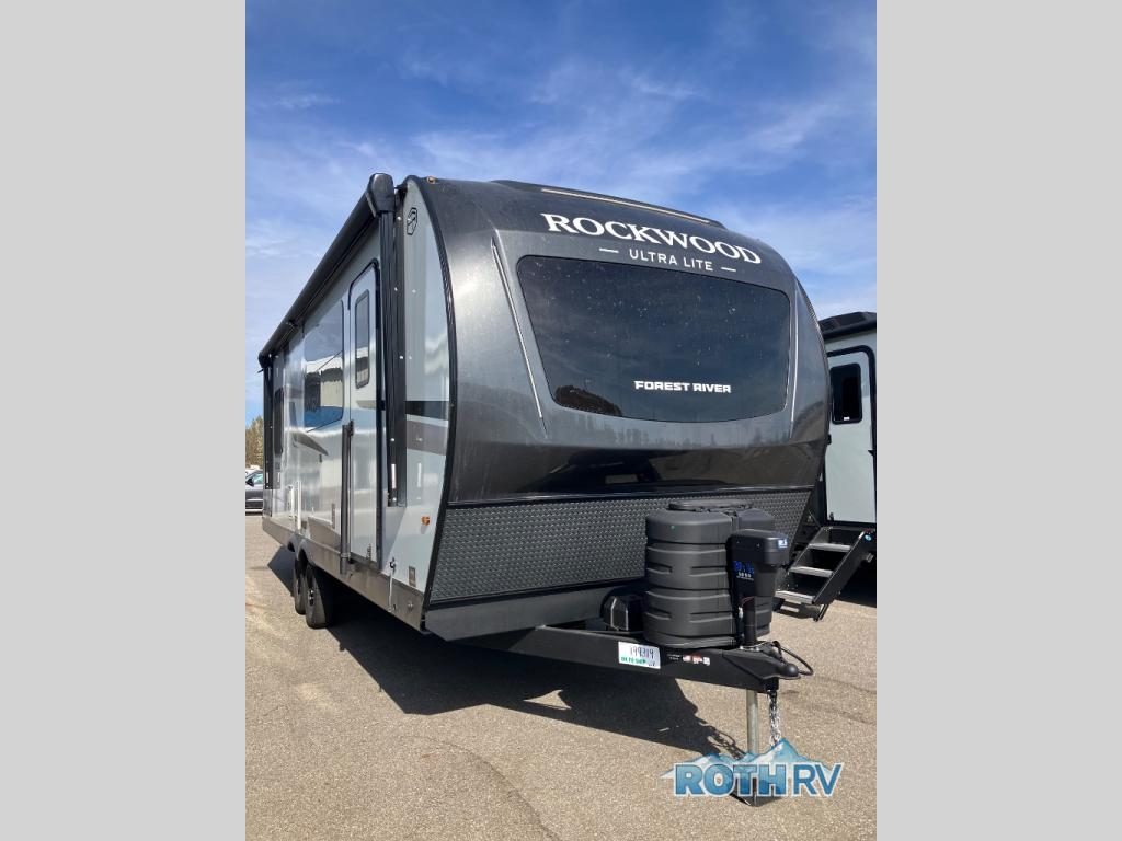 Each Rockwood Ultra Lite travel trailer by Forest River includes superior construction with a high gloss fiberglass cap, aluminum cage construction, and a power awning with LED lighting for a cozy and functional outdoor space. The torsion axle, power tongue jack will make towing smooth and hassle-free, along with the nitrogen filled, Goodyear Endurance tires and the tire pressure monitor system. Interior comforts include kitchen sink with high rise faucet, hidden hinge cabinet doors, and roller shades to name a few. Choose a Rockwood Ultra Lite travel trailer today!