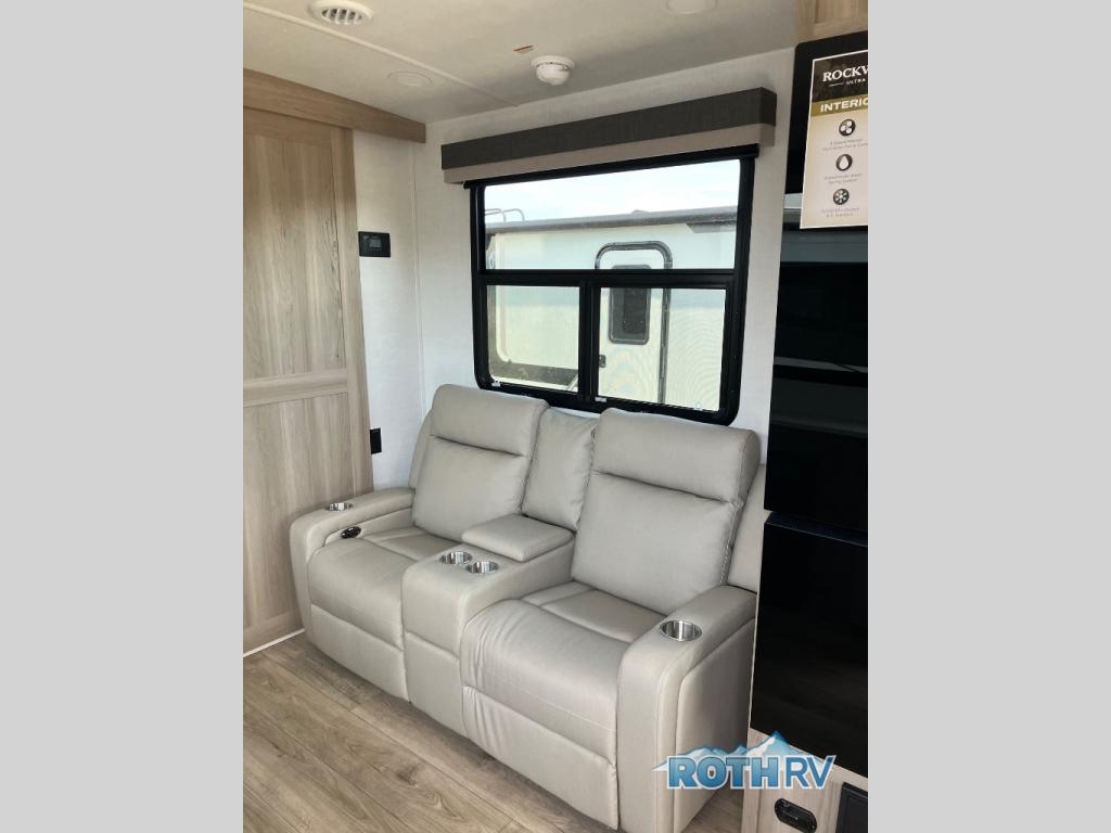 This Rockwood Ultra Lite 301FKT is fit for a cook! As soon as you step inside, you're greeted by the spacious front kitchen. Designed for convenience and style, it has long solid surface countertops that provide ample space for meal prep and organizing utensils. The overhead cabinets offer plenty of room to store dishes and ingredients for all your favorite recipes. After cooking, you can unwind on the 67" theater seat facing a TV with a lift, perfect for movie nights or catching up on your favorite shows. For meals, enjoy dining at the flip-up table with folding chairs, ideal for sharing breakfast, lunch, or dinner with your partner. And when it's time to relax, a full bathroom leads to the rear bedroom, where a king-sized bed awaits to give you a restful night's sleep.