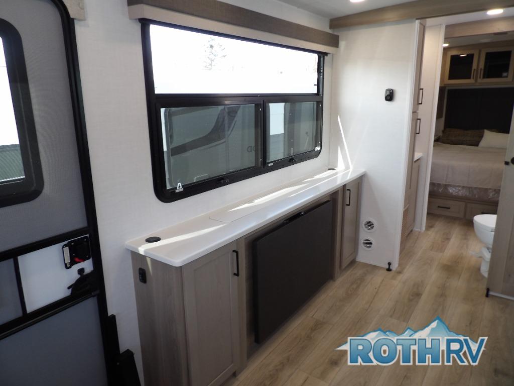 This Rockwood Ultra Lite is fit for a cook! As soon as you step inside, you're greeted by the spacious front kitchen. Designed for convenience and style, it has long solid surface countertops that provide ample space for meal prep and organizing utensils. The overhead cabinets offer plenty of room to store dishes and ingredients for all your favorite recipes. After cooking, you can unwind on the 67" theater seat facing a TV with a lift, perfect for movie nights or catching up on your favorite shows. For meals, enjoy dining at the flip-up table with folding chairs, ideal for sharing breakfast, lunch, or dinner with your partner. And when it's time to relax, a full bathroom leads to the rear bedroom, where a king-sized bed awaits to give you a restful night's sleep.