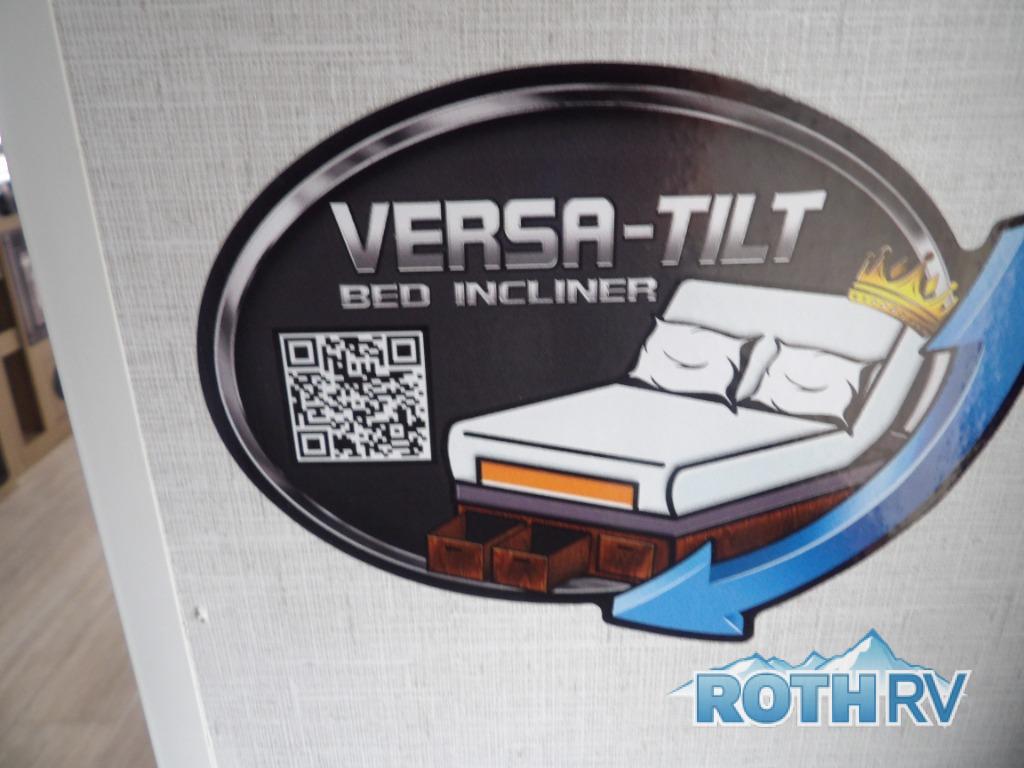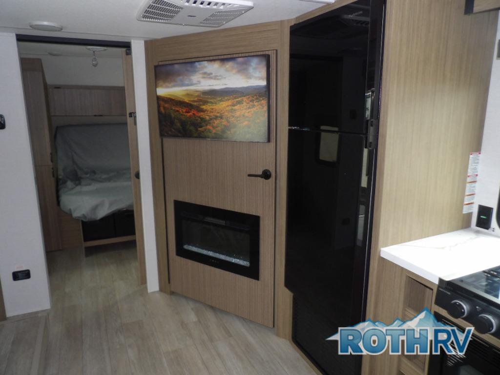 You're sure to make camping memories in this spacious travel trailer! You can easily sleep eight people each night thanks to the double-size bunks, the custom king bed with Versa Tilt in the front bedroom plus the Versa-Lounge within the large slide out! The cooktop and microwave oven will let you make meals each day, and you'll appreciate the hidden pantry with shelves behind the fireplace. There is also a booth dinette where you can dine together or play a game of cards after dinner is cleaned up, or you may just find yourselves outdoors under the 18' awning with 4K blade lighting. And don't overlook the full bath, complete with a tub/shower that will make bath time easier if you have little ones.