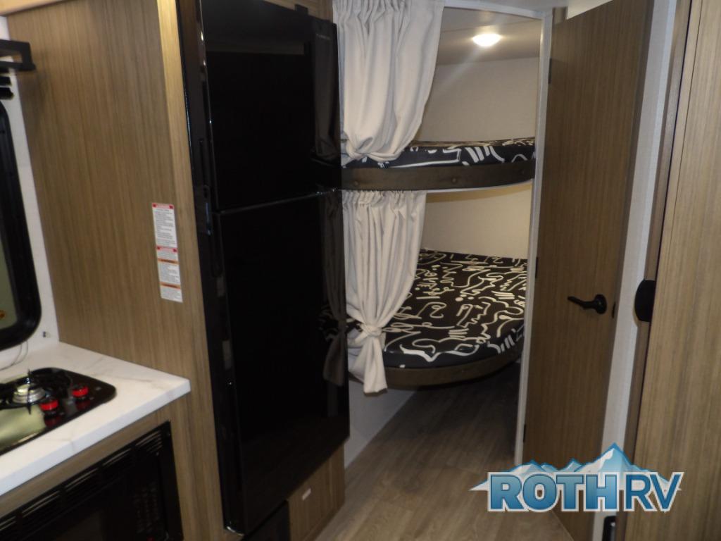 It will be so easy to enjoy time spent in this travel trailer for seven. The front queen bed provides a great night's rest, and there is an overhead cabinet to keep your things organized. Your guests or little ones can claim the double-size bunks for themselves, and there is a full bath adjacent to the bunks for easy nighttime use. A two-burner cooktop in the kitchen will let you make meals for your crew, and a refrigerator keeps leftovers fresh. You can dine at the booth dinette within the slide out or take your plate outdoors to sit under the 15' power awning.