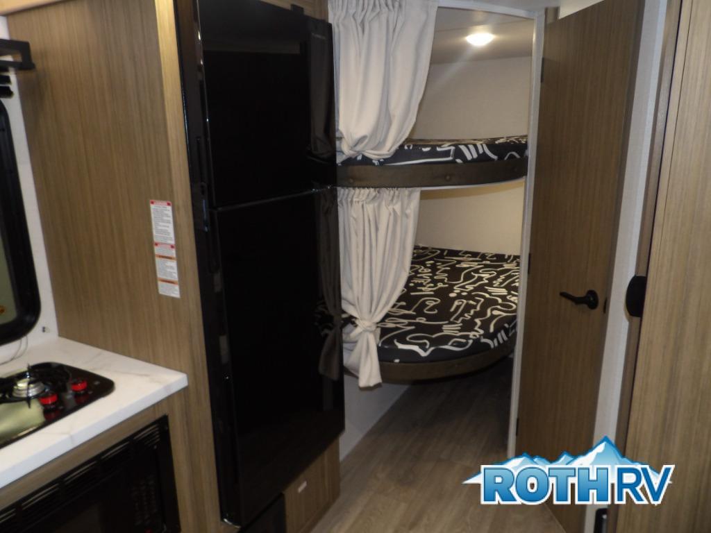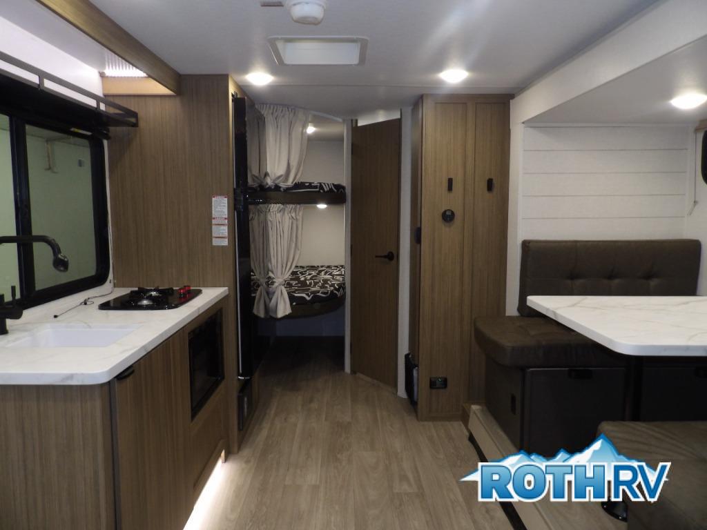 It will be so easy to enjoy time spent in this travel trailer for seven. The front queen bed provides a great night's rest, and there is an overhead cabinet to keep your things organized. Your guests or little ones can claim the double-size bunks for themselves, and there is a full bath adjacent to the bunks for easy nighttime use. A two-burner cooktop in the kitchen will let you make meals for your crew, and a refrigerator keeps leftovers fresh. You can dine at the booth dinette within the slide out or take your plate outdoors to sit under the 15' power awning.
