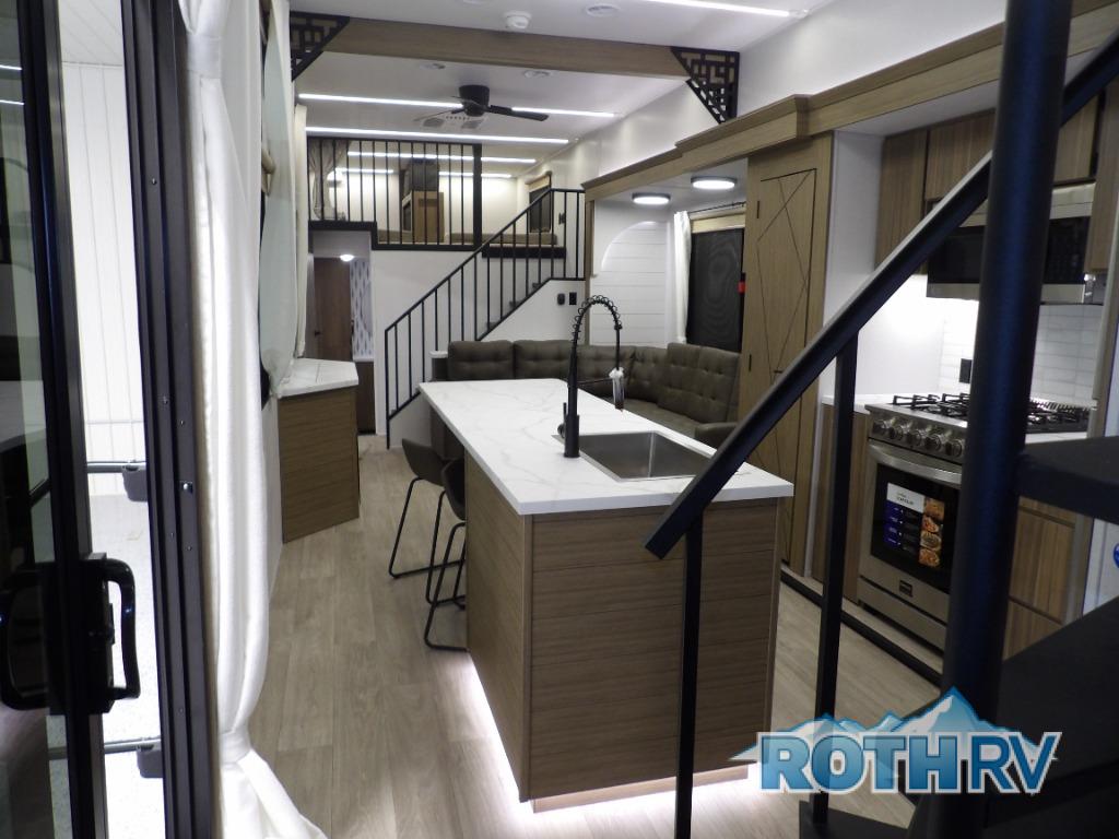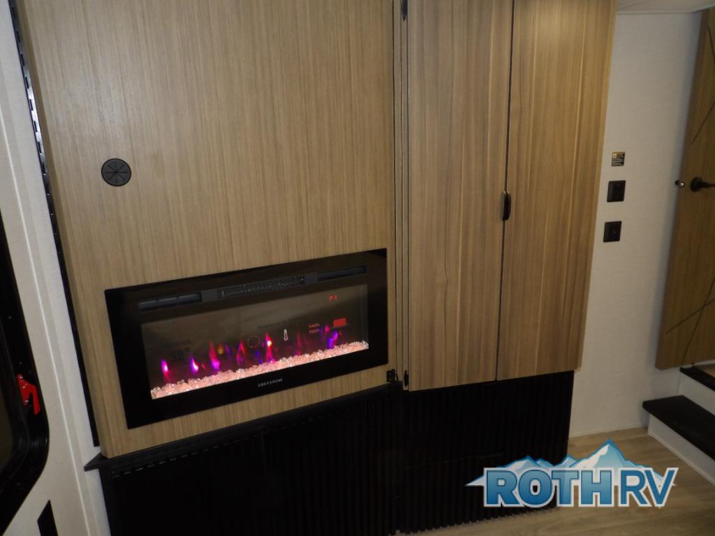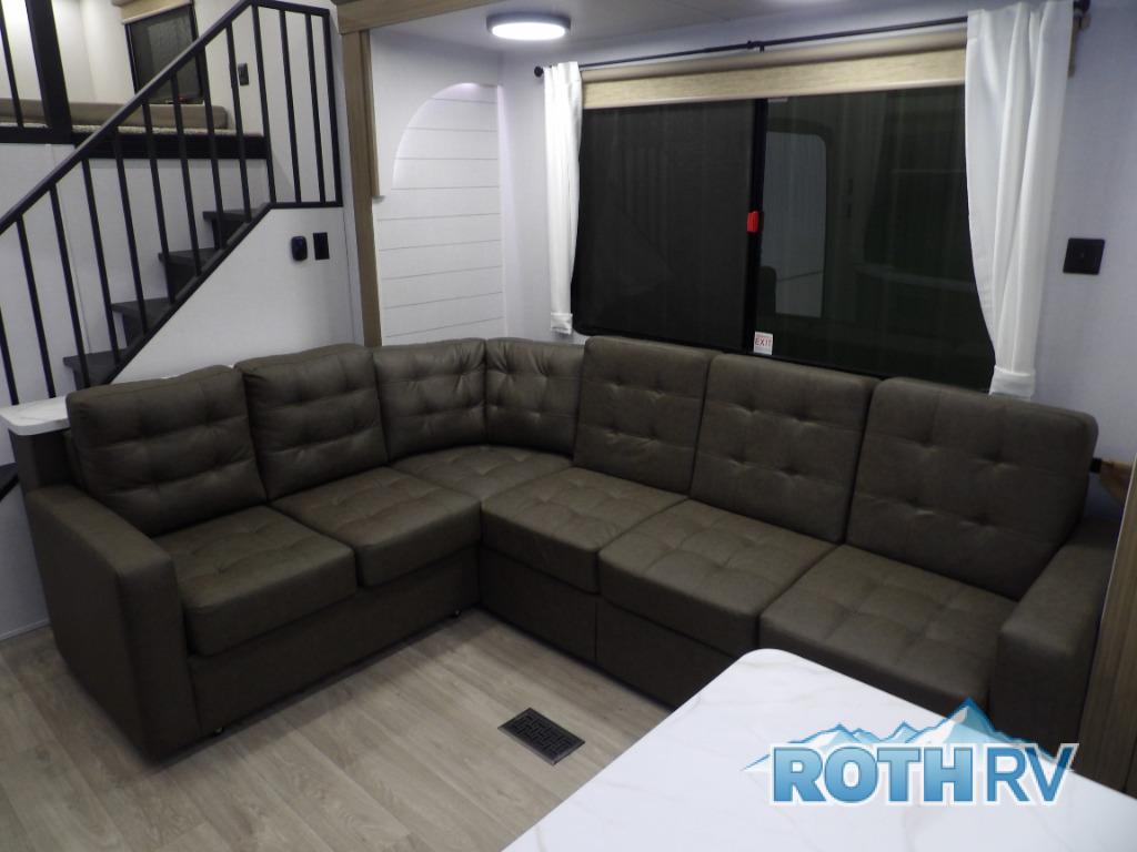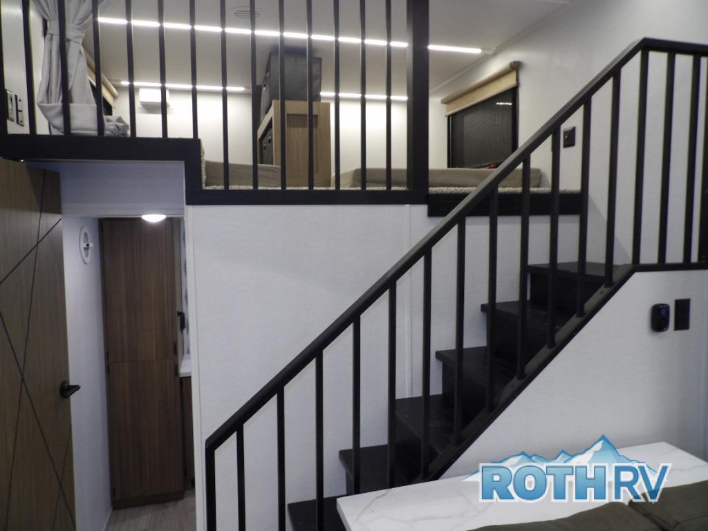 This trailer is built with comfort and convenience in mind, offering plenty of sleeping space for the whole gang. It has two spacious lofts, each equipped with two 42" x 72" bunk mats, plus an extra 36" x 38" bunk mat, providing cozy sleeping spots for everyone. Each loft also includes built-in storage for essentials, and instead of climbing a ladder, easy stair access makes getting in and out much safer. On the main floor, you’ll find a full rear bathroom with a walk-in shower and washer/dryer prep. The main living area has a large sectional sofa, perfect for gathering the group to watch the TV on the Televator or relaxing by the fireplace after a day outdoors. The kitchen is equipped with all the essentials, including a large pantry, overhead cabinets for snack storage, a fridge, and a kitchen island that adds prep space. Up front, the private bedroom has a king bed with Versa Tilt, a dresser, and shelves to keep your clothes and camp gear neatly organized. Regardless that you're adventuring about, this trailer is ready to make every trip feel like home.