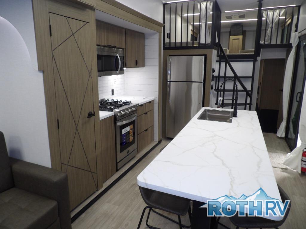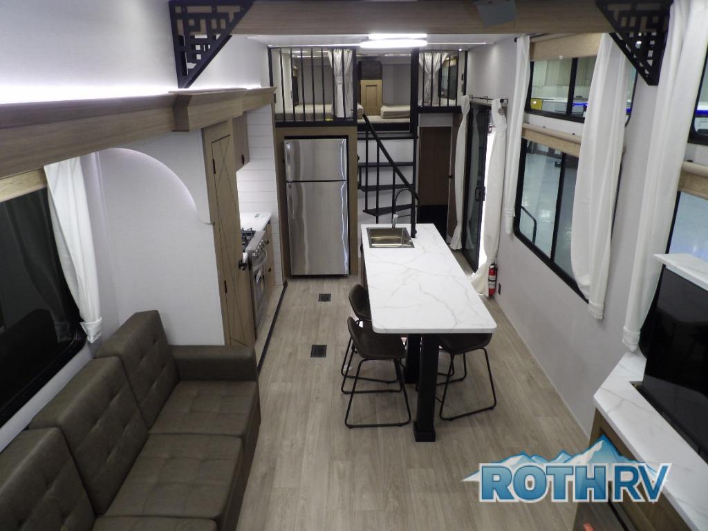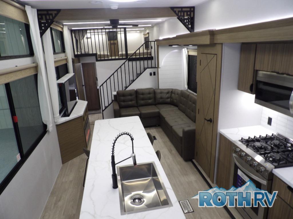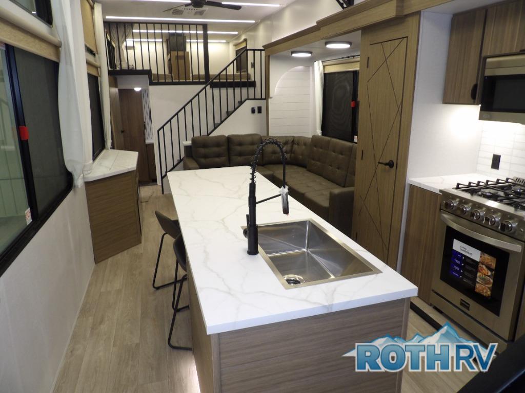 This trailer is built with comfort and convenience in mind, offering plenty of sleeping space for the whole gang. It has two spacious lofts, each equipped with two 42" x 72" bunk mats, plus an extra 36" x 38" bunk mat, providing cozy sleeping spots for everyone. Each loft also includes built-in storage for essentials, and instead of climbing a ladder, easy stair access makes getting in and out much safer. On the main floor, you’ll find a full rear bathroom with a walk-in shower and washer/dryer prep. The main living area has a large sectional sofa, perfect for gathering the group to watch the TV on the Televator or relaxing by the fireplace after a day outdoors. The kitchen is equipped with all the essentials, including a large pantry, overhead cabinets for snack storage, a fridge, and a kitchen island that adds prep space. Up front, the private bedroom has a king bed with Versa Tilt, a dresser, and shelves to keep your clothes and camp gear neatly organized. Regardless that you're adventuring about, this trailer is ready to make every trip feel like home.