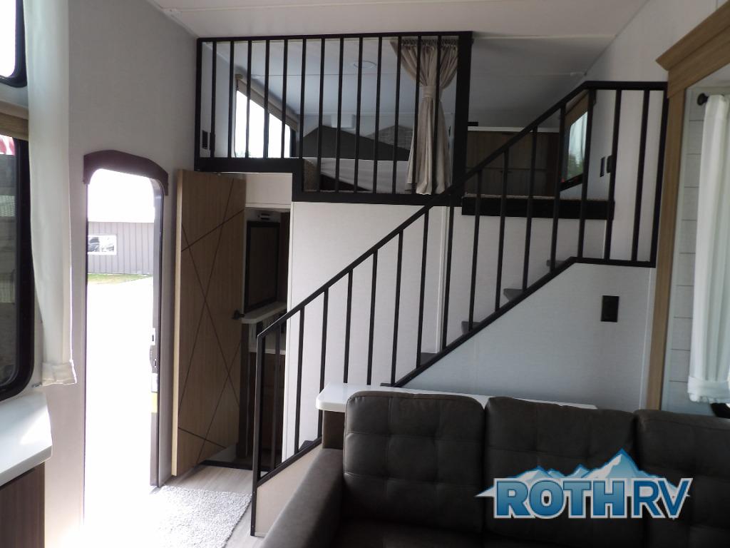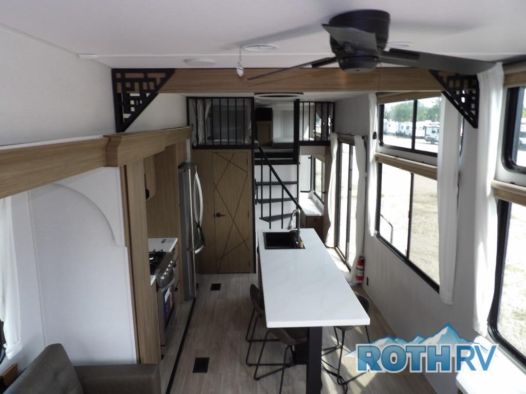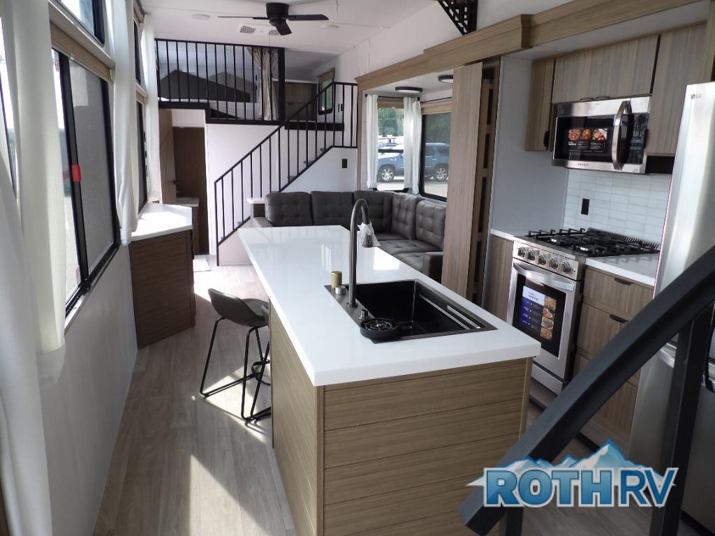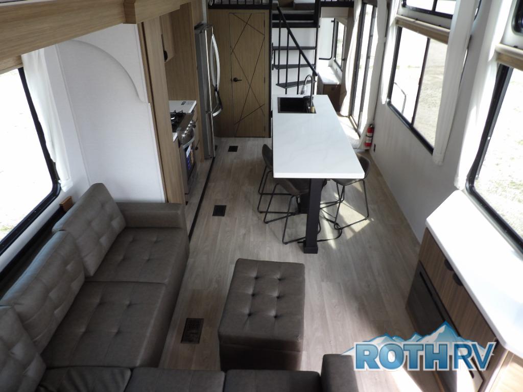 This 44ZEN trailer is designed to offer maximum comfort and space. It features two lofts that adds extra sleeping space, one includes a 62" x 74" Versa queen mattress and a dresser for personal items, while the second loft comes with a Versa queen bed, shelf and cabinet storage, and a table with recessed footing, perfect for remote work or study sessions. On the main floor, the rear full bathroom is fully equipped with a walk-in shower, linen closet, and washer/dryer prep. At the center we have a large sectional sofa invites everyone to gather, facing a fireplace and Televator TV, great for movie nights or relaxing. The kitchen island adds prep space but also doubles as a casual dining area with barstool seating. For added convenience, a half bath is tucked beside the second stairway, providing easy access if needed. Up front, the master bedroom offers a retreat with a king-size bed with Versa Tilt, a dresser for storage, and a wall of windows that provides a view of the scenery outside.