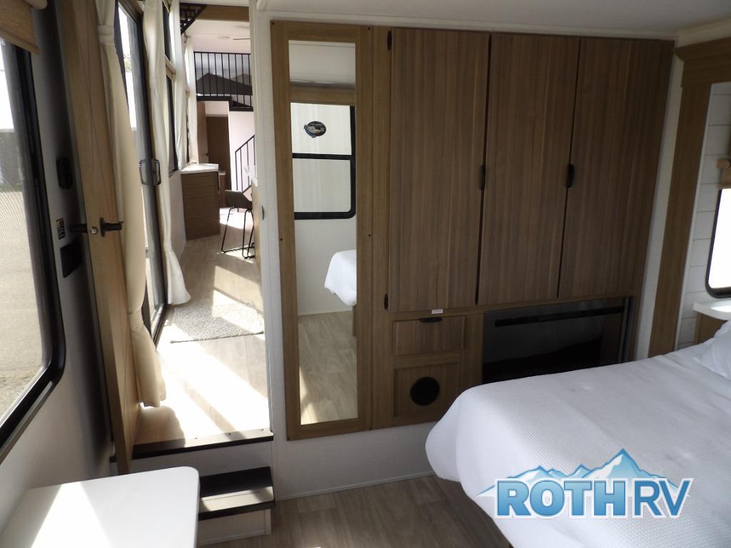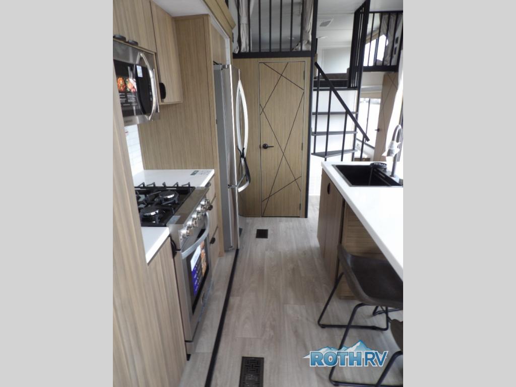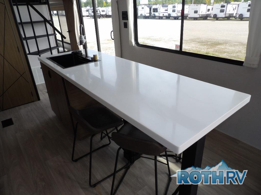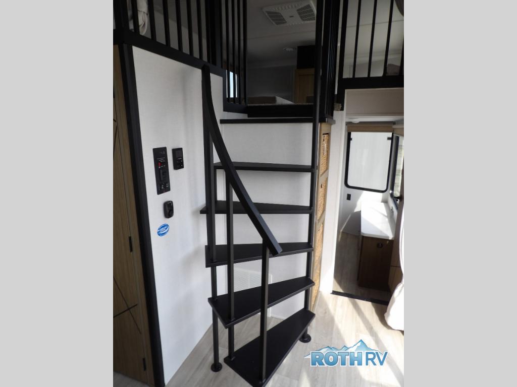 This 44ZEN trailer is designed to offer maximum comfort and space. It features two lofts that adds extra sleeping space, one includes a 62" x 74" Versa queen mattress and a dresser for personal items, while the second loft comes with a Versa queen bed, shelf and cabinet storage, and a table with recessed footing, perfect for remote work or study sessions. On the main floor, the rear full bathroom is fully equipped with a walk-in shower, linen closet, and washer/dryer prep. At the center we have a large sectional sofa invites everyone to gather, facing a fireplace and Televator TV, great for movie nights or relaxing. The kitchen island adds prep space but also doubles as a casual dining area with barstool seating. For added convenience, a half bath is tucked beside the second stairway, providing easy access if needed. Up front, the master bedroom offers a retreat with a king-size bed with Versa Tilt, a dresser for storage, and a wall of windows that provides a view of the scenery outside.