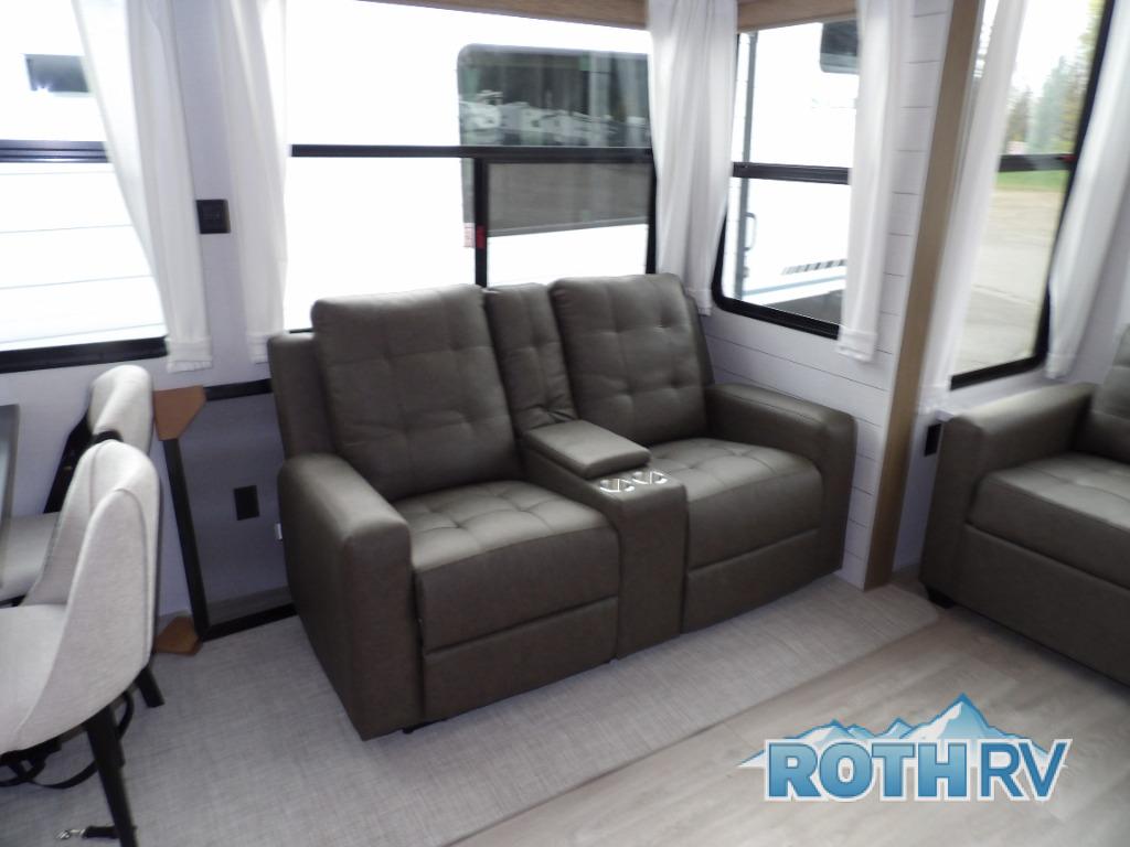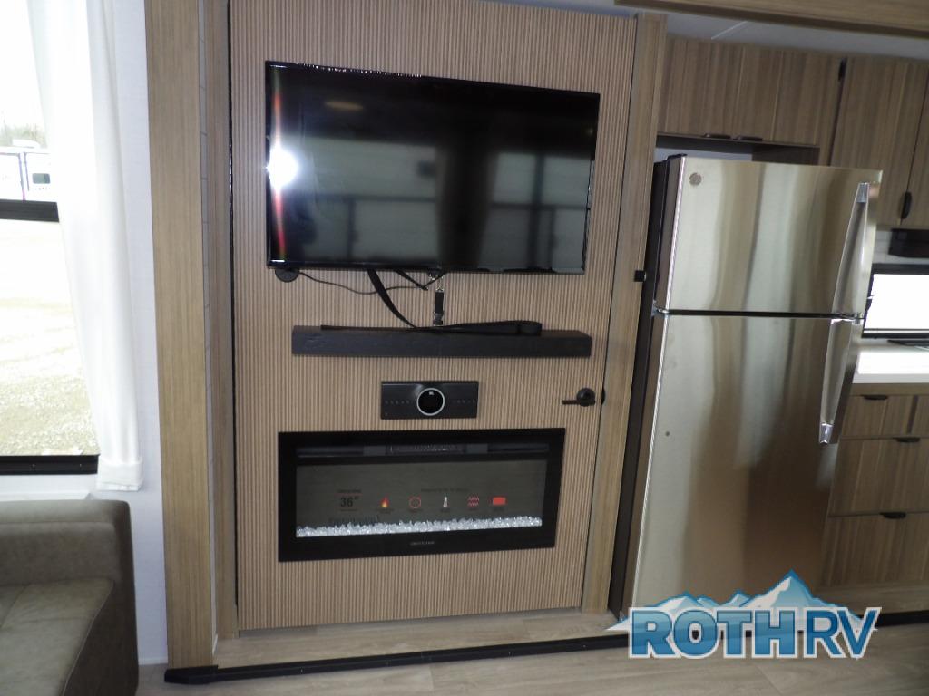 Head to your favorite place for a long weekend, or for your next adventure with this Salem Villa destination trailer. You are going to love the L-shaped bar area with two bar height chairs plus a sink and mini refrigerator for beverages. The rest of the kitchen area is wide open with dual opposing slides featuring stainless steel appliances, a kitchen island with a double sink, and a dining table with four chairs. The living area, which is combined here, features a sofa and theater seating for movie night or just relaxing. Enjoy the added ambiance from the fireplace with a entertainment center. Head to your right as you enter the main patio door and find a full bath with walk-in shower, toilet, plus a vanity with sink and medicine cabinet overhead. There is also a walk-in pantry for all of your storage needs. Continue on to the front master bedroom where you will enjoy a great night's rest on a king bed with Versa Tilt. There is also a nice closet with optional washer and dryer prep if you want the option to make laundry day easier.