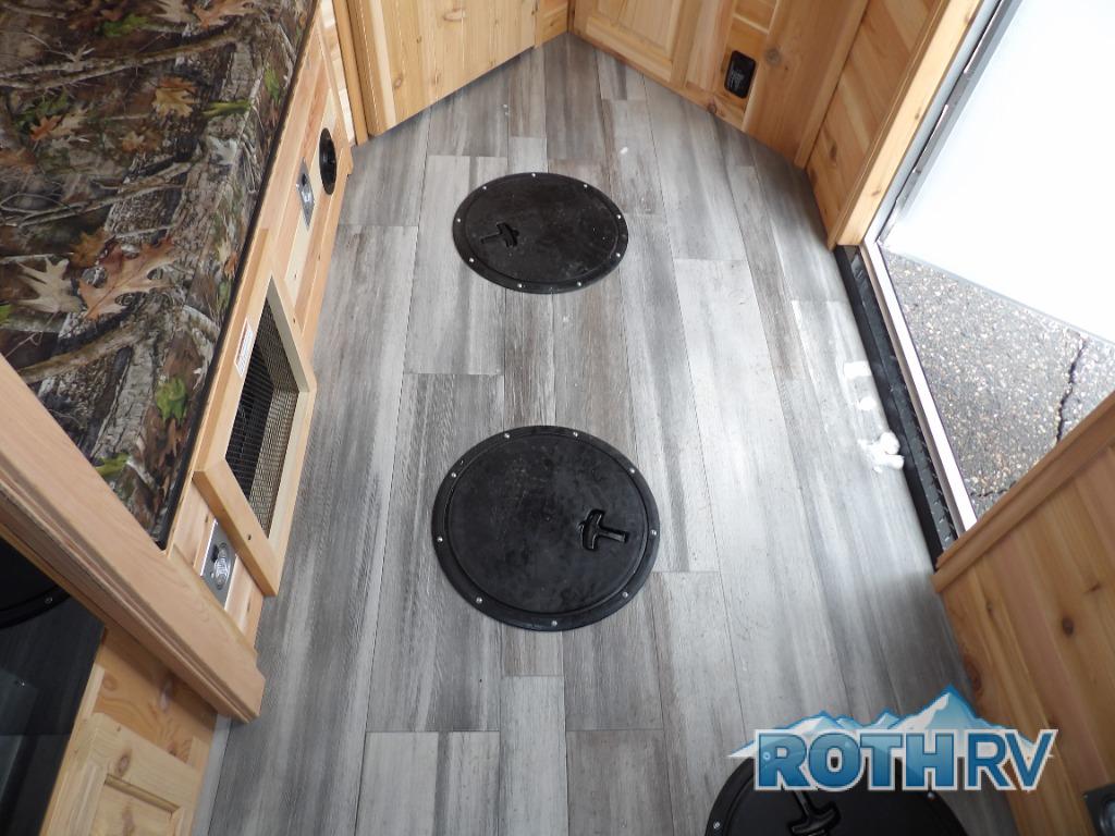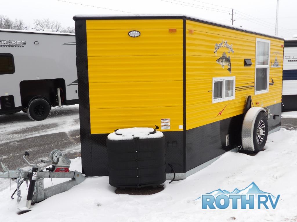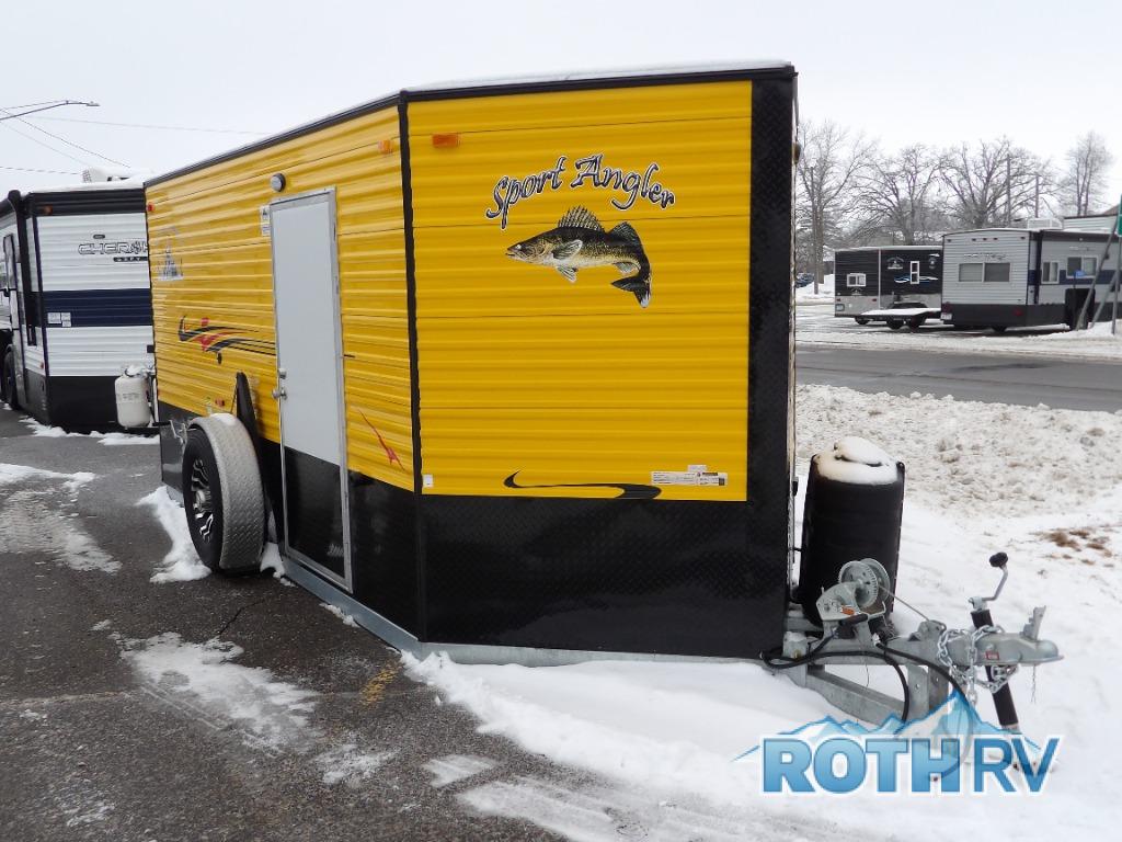 Your next weekend trip can include a little bit of fishing and a whole lot of relaxing with this V-nose 6.5 x 14V Sport Angler fish house! Throughout this model there are five fishing holes. In the back of this model you will find a 68" jackknife sofa which converts into additional sleeping space, and above the sofa you will find a 30" upper bunk. With the three-burner cooktop with oven, you can easily prepare snacks and meals while you are out. Maybe even fresh catch of the day since there is a range hood with vent. A bathroom area with a toilet seat is located in the front V-nose for convenience.