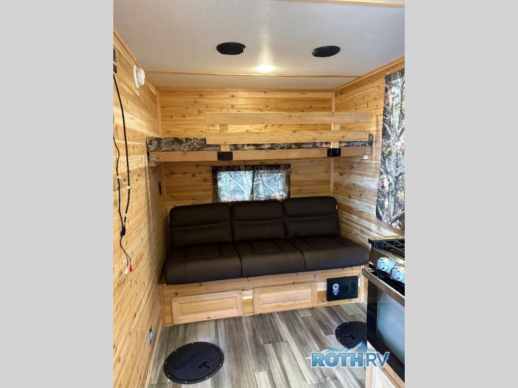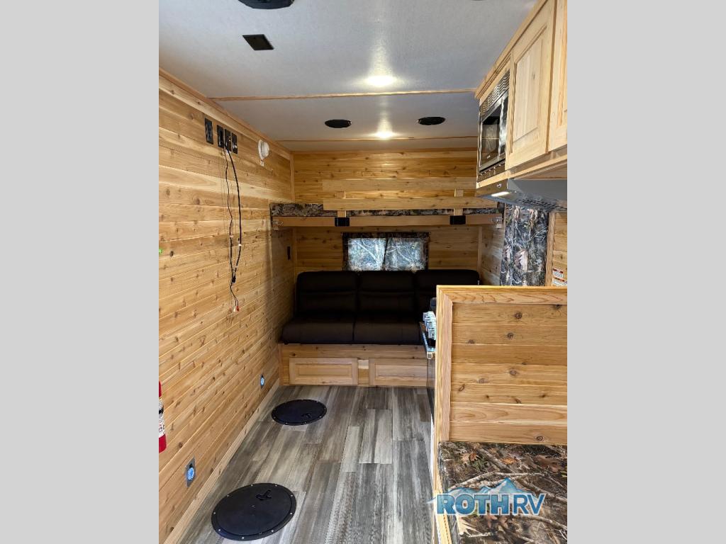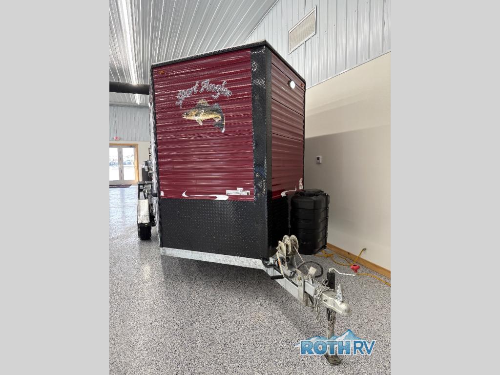 Your next weekend trip can include a little bit of fishing and a whole lot of relaxing with this V-nose 6.5 x 14V Sport Angler fish house! Throughout this model there are five fishing holes. In the back of this model you will find a 68" jackknife sofa which converts into additional sleeping space, and above the sofa you will find a 30" upper bunk. With the three-burner cooktop with oven, you can easily prepare snacks and meals while you are out. Maybe even fresh catch of the day since there is a range hood with vent. A bathroom area with a toilet seat is located in the front V-nose for convenience.