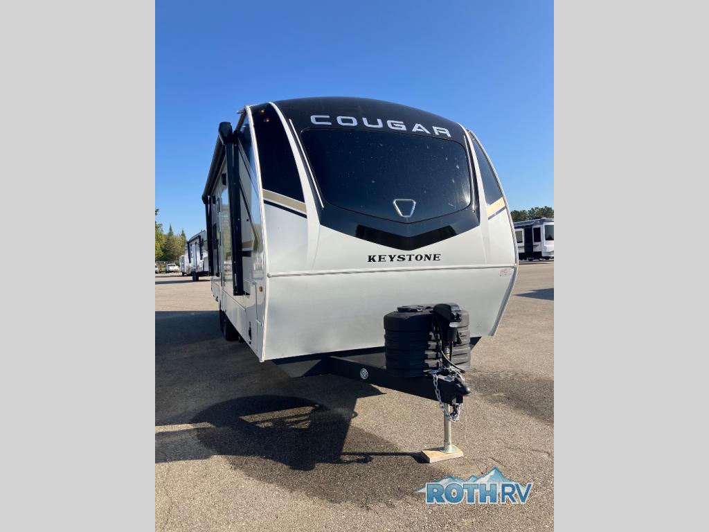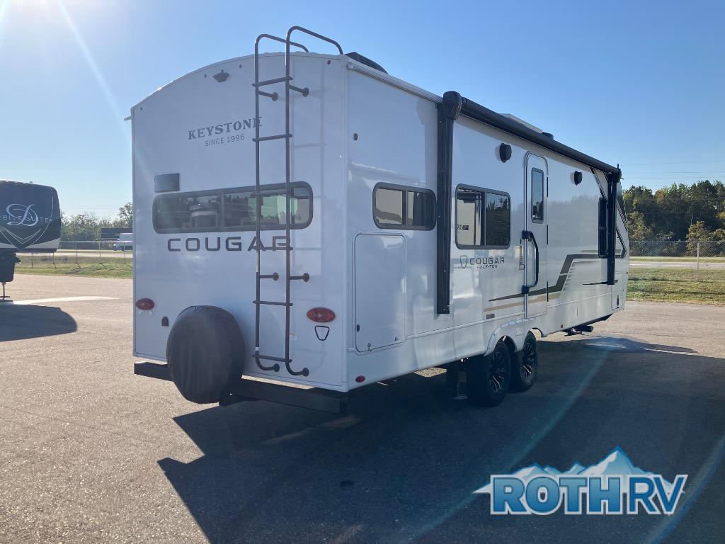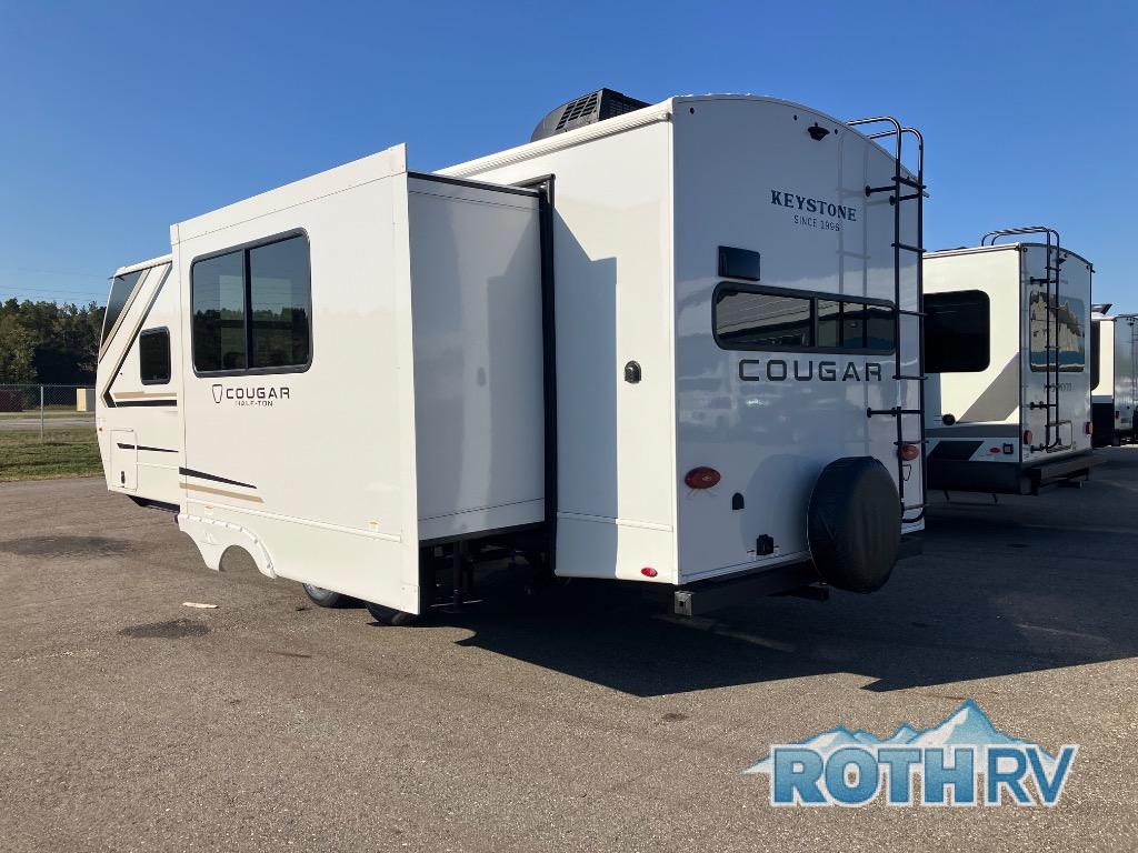 The Keystone Cougar Half-Ton fifth wheel and travel trailers are known as one of America's favorites for a reason! Some of those reasons are the exclusive features that come from Keystone, like the Winegard Air 360+ omni-directional rooftop antenna, the in-floor heating ducts, and the HyperCore composite wall construction with Vixen Fibrogloss high-gloss finish. The Cougar Half-Ton has a Climate Guard protection package with heat-deflecting white sidewalls, two roof attic vents, PEX plumbing and more to enjoy four season camping. Inside, you'll love the dimmable lighting, night roller shades throughout, shower skylight, and bedside USB outlets to keep your electronics charged.