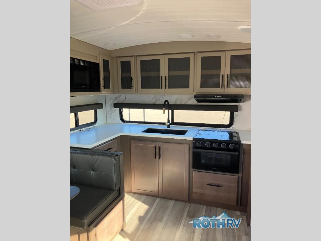 If you're ready for fun summers at the lake, make your adventures complete with this travel trailer in tow. The rear kitchen includes ample counter space to prep burgers, and you can take your preparations outside with the outdoor kitchen prep area. If the weather is nice, you might just want to eat outside too under the 18' power awning, or dine inside at the booth dinette. There is also a tri-fold sleeper sofa within the large slide out and an LED HDTV for movie nights. You'll find plenty of storage throughout, including a kitchen pantry, overhead cabinets, plus dual bedroom nighstands on either side of the king bed!
