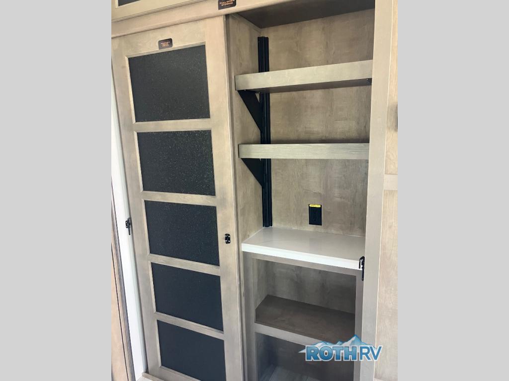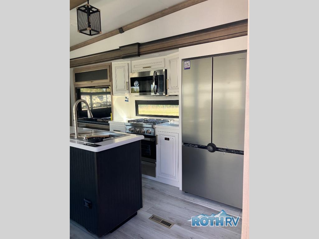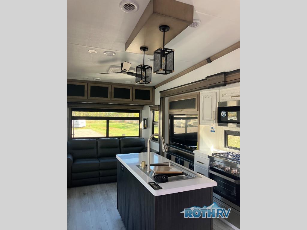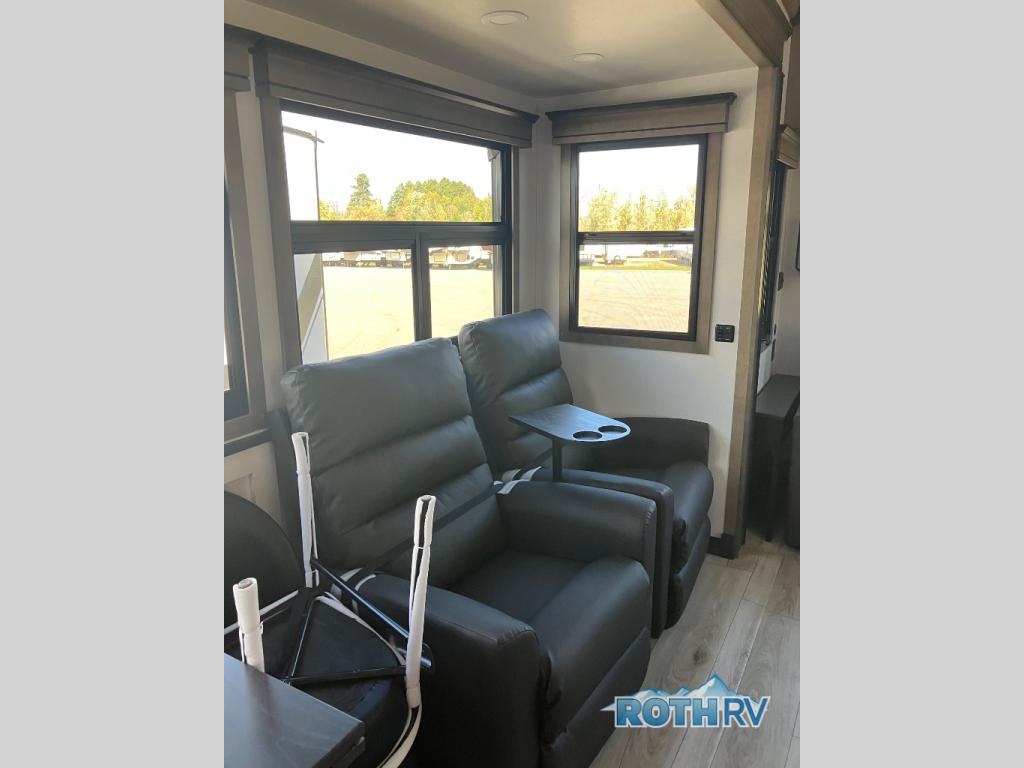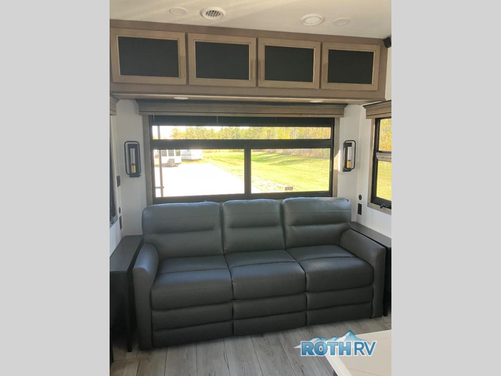 Luxury abounds throughout this fifth wheel! Starting in the kitchen with the island, pull down storage panty, 24" range, and residential convection microwave. The full bathroom has a 48" x 30" fiberglass shower with a seat, decorative glass enclosure, and a skylight above it for more natural lighting. Sleep like a baby in the front private bedroom on the king bed slide with storage underneath and keep your clothes looking their best with the front closet that has dual closets and additional storage. The rear living area offers true relaxation with a hide-a-bed sofa and residential power recliners, and there is a pivot dinette where you can dine at.