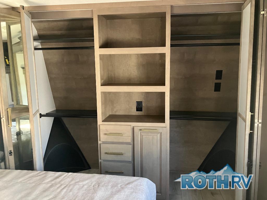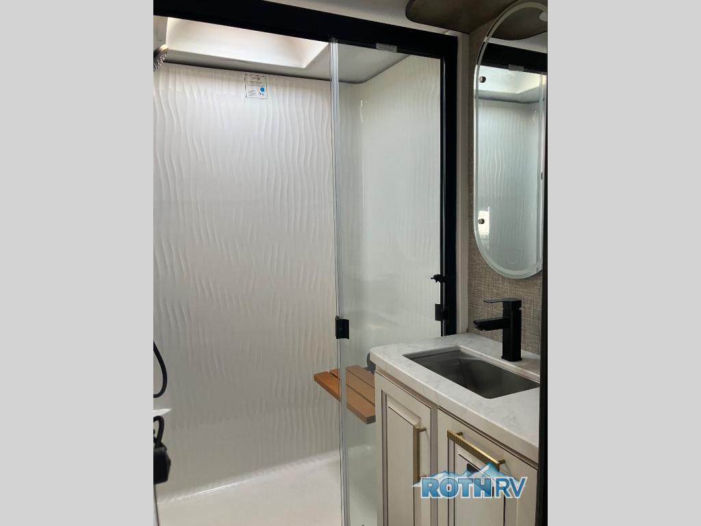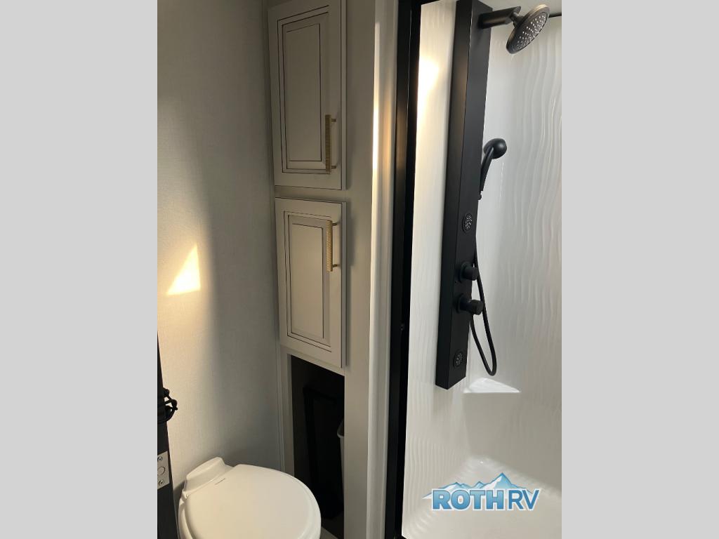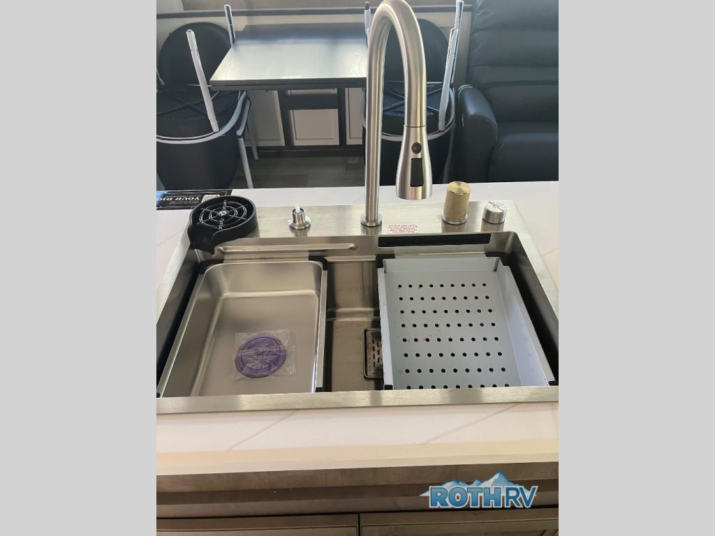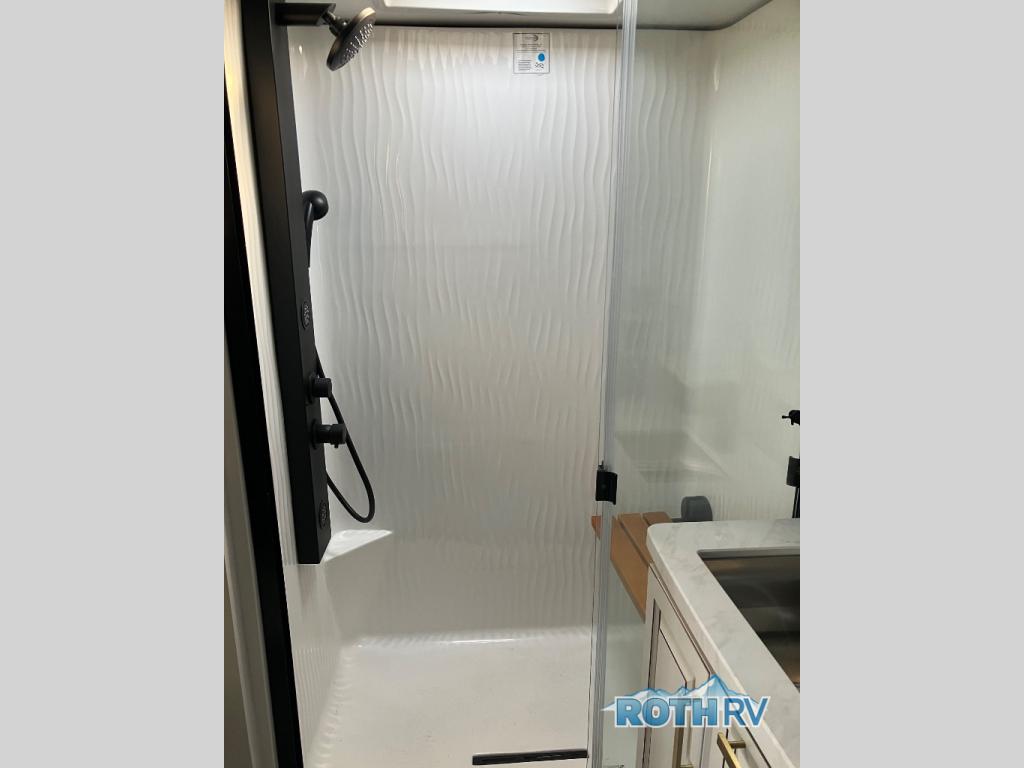 Luxury abounds throughout this fifth wheel! Starting in the kitchen with the island, pull down storage panty, 24" range, and residential convection microwave. The full bathroom has a 48" x 30" fiberglass shower with a seat, decorative glass enclosure, and a skylight above it for more natural lighting. Sleep like a baby in the front private bedroom on the king bed slide with storage underneath and keep your clothes looking their best with the front closet that has dual closets and additional storage. The rear living area offers true relaxation with a hide-a-bed sofa and residential power recliners, and there is a pivot dinette where you can dine at.