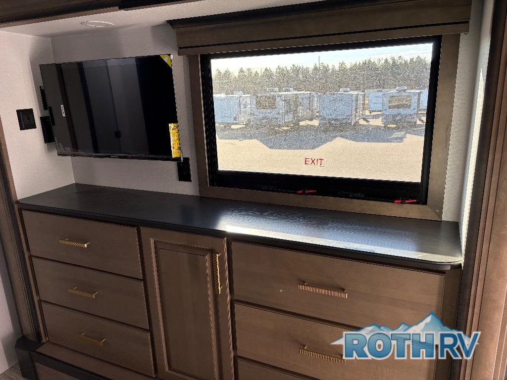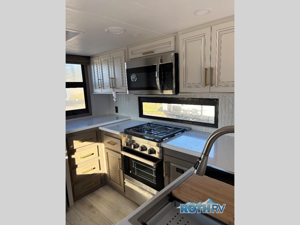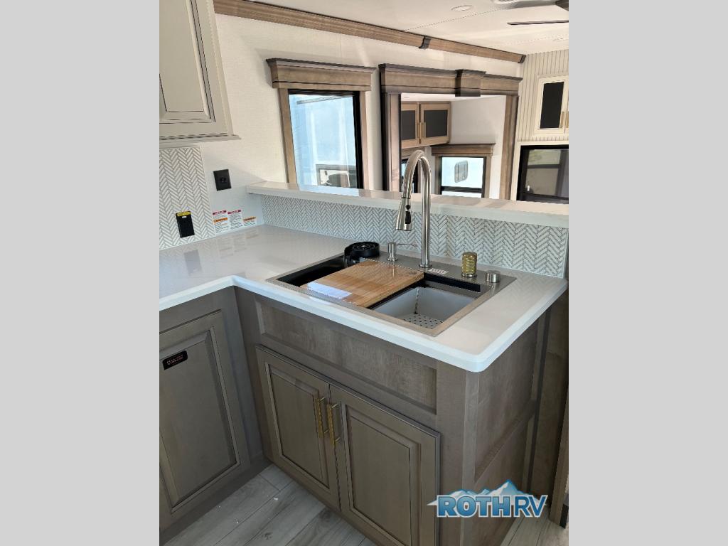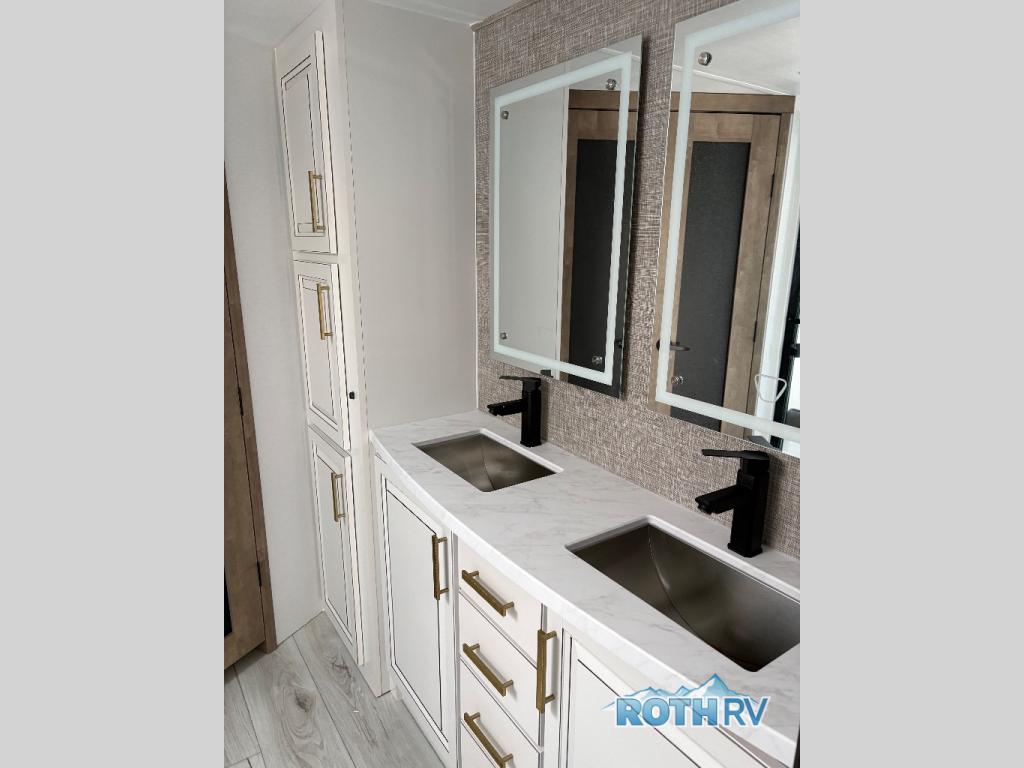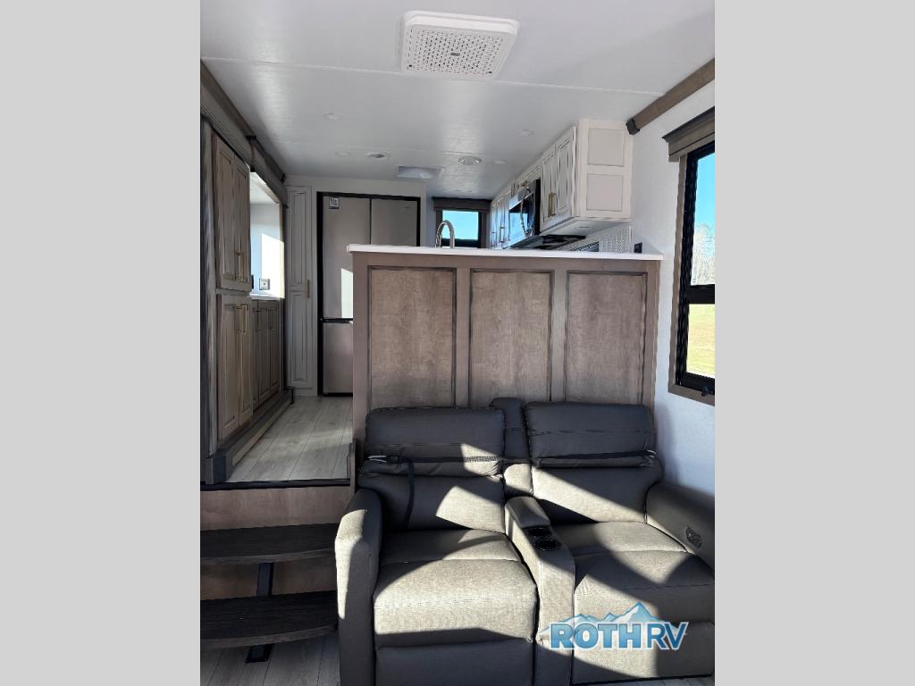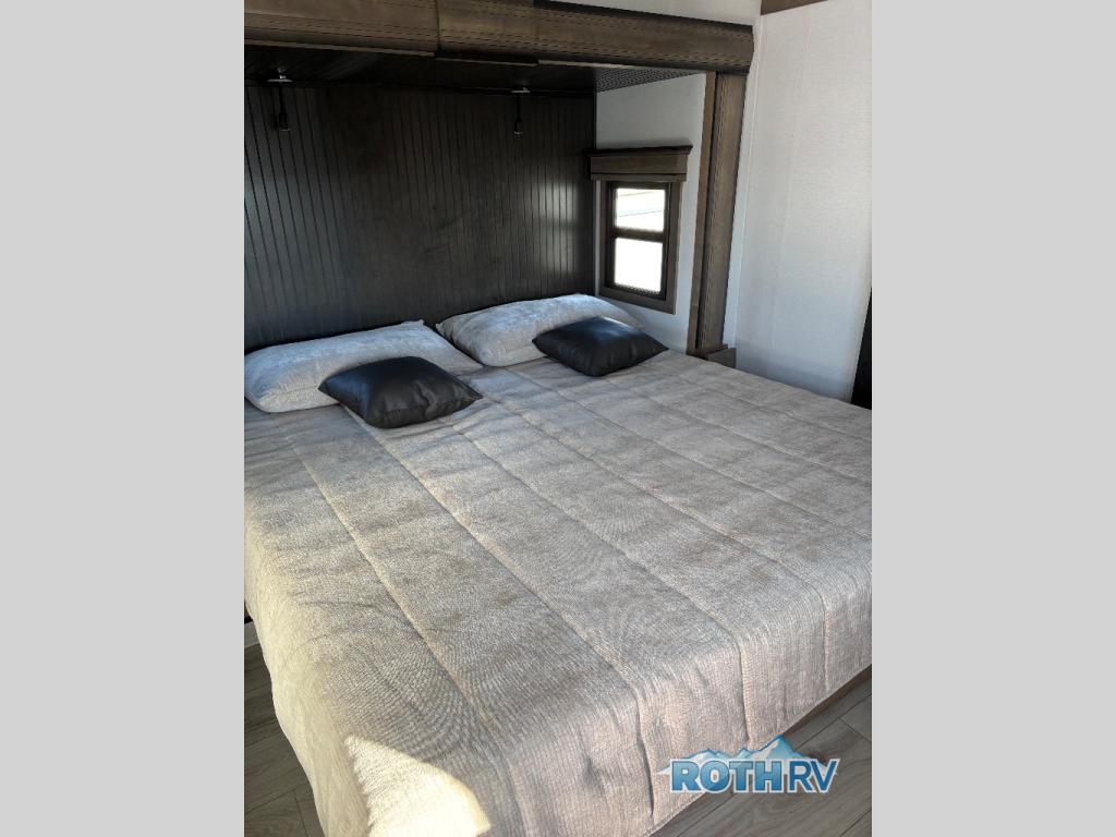The perfect RV when you like to take "home"' with you when you travel! This Montana fifth wheel gives you the space you want and it feels like home with plenty of features to love and keep you comfortable when you are out enjoying your adventures. Five slides in total give each space plenty of room, the raised rear kitchen has everything you need to cook up meals and snacks just like at home. An 18 cu. ft. residential refrigerator with an ice maker, convection microwave oven and large sink, plus pantry space will make any chef happy. The mid-coach space just inside the door features a living room and half bath for convenience. There is also a pivot dinette within the roadside slide. Step up in front through a sliding barn door to a double slide space with a king bed and dresser. A second sliding door leads into the front spacious master bath featuring dual sinks, a 48" x 30" shower, and a large walk-in wardrobe with washer and dryer prep!