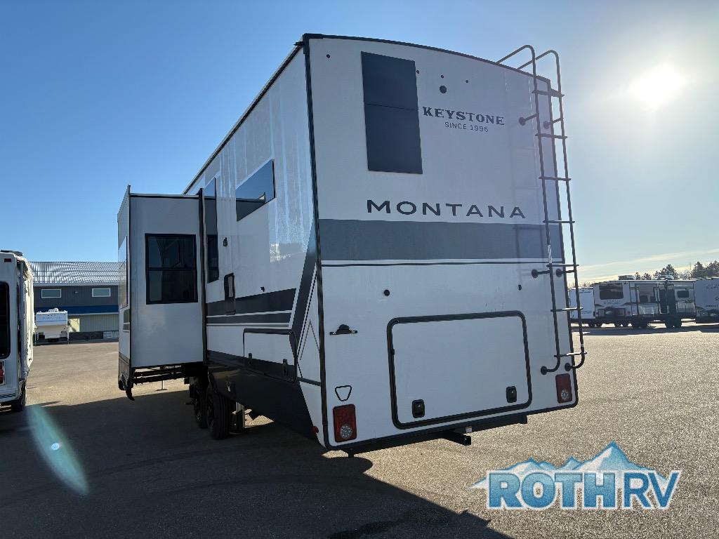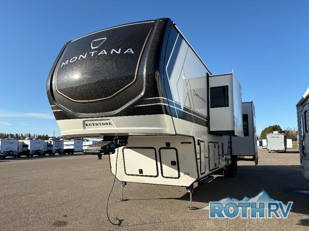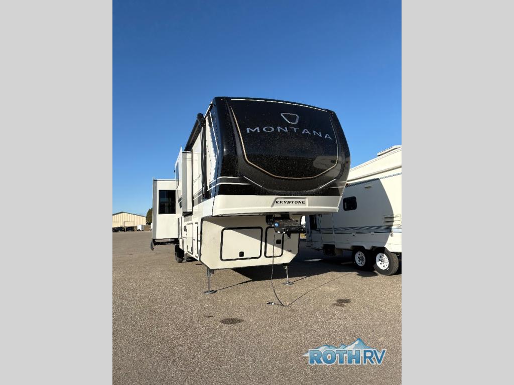 Enjoy luxury, innovation, and the outdoors in any one of Montana's finest fifth wheels. Each set the standard with exceptional features, and exciting factory installed options to provide you a great home on the road. Keystone's 12" I-beam chassis with z-frame technology provides a strong and durable foundation to your fifth wheel, and the four season living package will help extend your camping season. A few other construction features you will appreciate include a MORryde CRE3000 suspension, a fully walkable roof with an alpha seamless TPO membrane system, and 4k square frameless tinted safety glass windows. Each feature stylish interiors with two decor choices paired with beautiful hardwood cabinetry, Beauflor vinyl flooring throughout, central vacuum, plus a La-Z-Boy furniture package for all-around comfort!